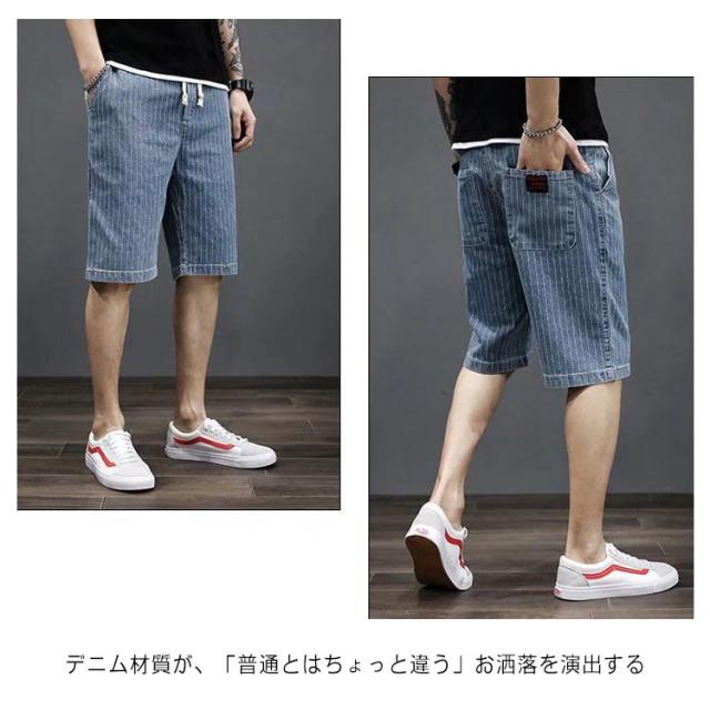ショートパンツ メンズ デニムパンツ おしゃれ ストライプ ハーフパンツ ジーンズ 短パン ひざ下 膝下 半パンツ 五分丈 男性 ボトムス ウェストゴム カジュアル ストレッチ 薄手 速乾 超軽量 快適 お洒落 ゆったり カジュアル ブラック ブルー 大きいサイズ 送料無料
