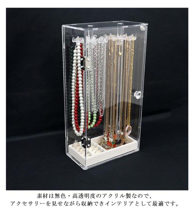 | ネックレスが絡まずに収納出来るだけじゃないっ!お気に入りのジュエリーを、飾って、見せて、便利に収納! 扉式なのでネックレスの出し入れも楽々!扉の取っ手を軽く押し上げると扉が開きます。 フックは回転するので、奥に吊るしたものも取り出しやすくなってます! (底部)収納ケースもついているので、ネックレス以外にもリングやブレスレットなどの小物もまとめて収納できるのが嬉しいですね♪ 素材は無色・高透明度のアクリル製なので、アクセサリーを見せながら収納できインテリアとして最適です。 透明度が高く、シンプルなデザインなのでネックレスを入れて飾っておくだけで お部屋のインテリアにも! 24本のフック付き!最大72本ネックレスがかけられます。 | |