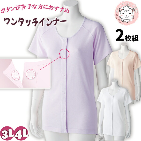3分袖 ワンタッチシャツ 2枚組 抗菌 防臭 綿100% ラグラン袖 前開き 3L/4L | 婦人用 ワンタッチテープ式 インナー 肌着 シャツ 半袖 三分袖 名前ラベル付き