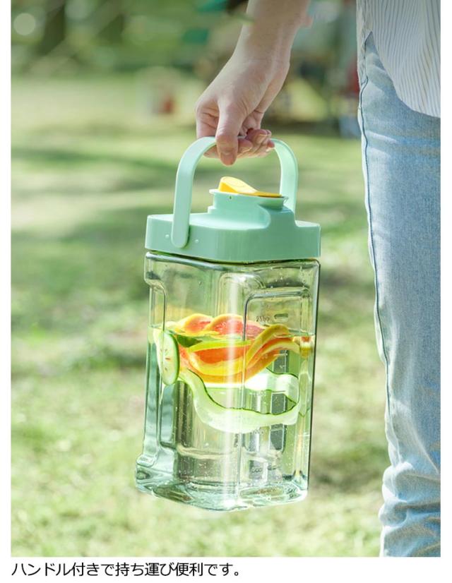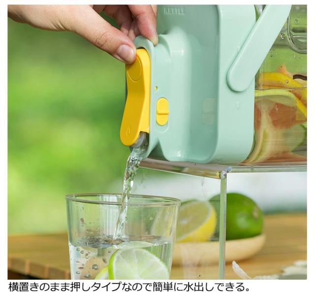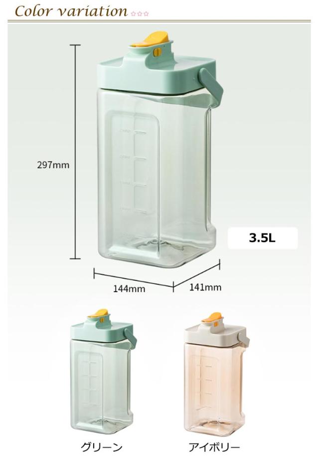 | 横置き可能な3.5L大容量、耐熱耐冷(-20℃~100℃)ウォーターピッチャー。【2個セット】 容量は気温が上がる時期に嬉しいたっぷり3.5L。 横置きもできるので、冷蔵庫の中での置き場所にも困りません。 口が広いので氷や茶葉を入れやすく、洗いやすいのも魅力。 ハンドル付きで持ち運び便利です。 横置きのまま押しタイプなので簡単に水出しできる。 | |