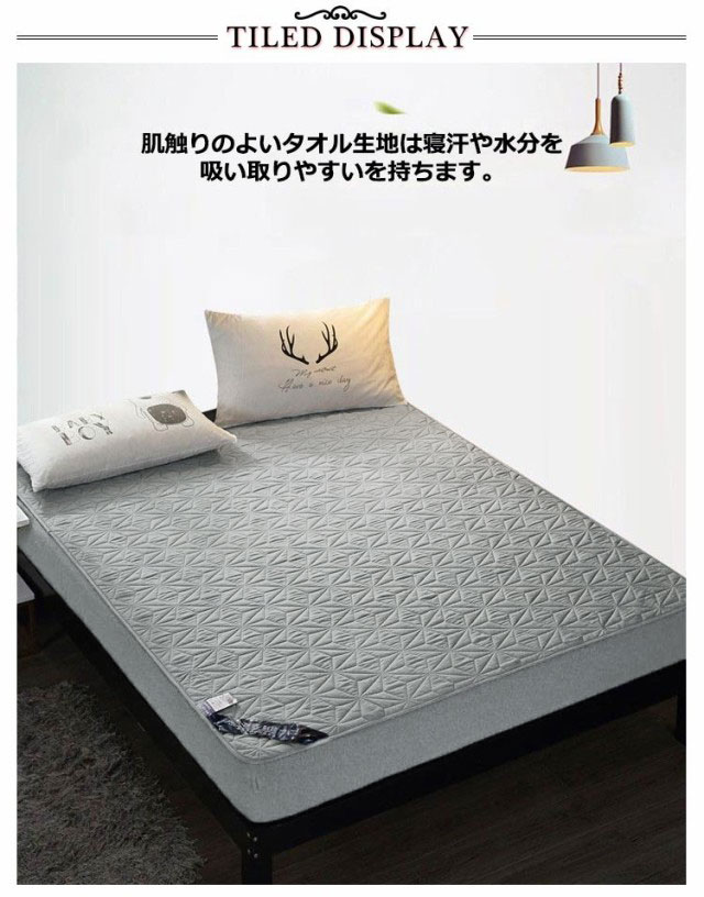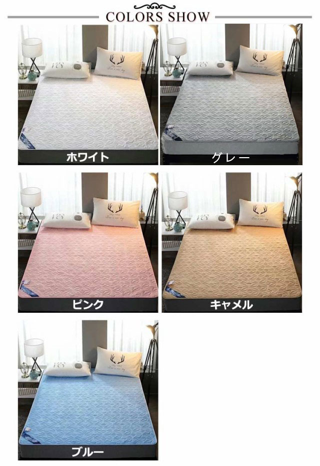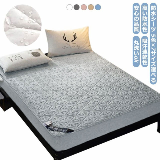 | 【防水シーツ 5色×7サイズ 選べる!】 【高い防水性】 【吸汗速乾性】 【丸洗いok】 【安心の品質】 コーティング加工面の防水性が高く、マットレスに水分は到達しません。 肌触りのよいタオル生地は寝汗や水分を吸い取りやすいを持ちます。 汗をかいても爽やかで、サラッと快適に眠れます。 お手入れ方法が簡単。洗濯機で丸洗いできることで清潔・衛生的に保ちます。 肌触りも良く、敏感肌持ちの方にも安心して使える防水シーツです。 | |