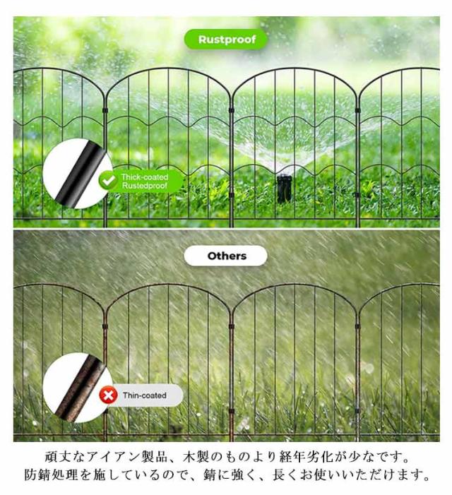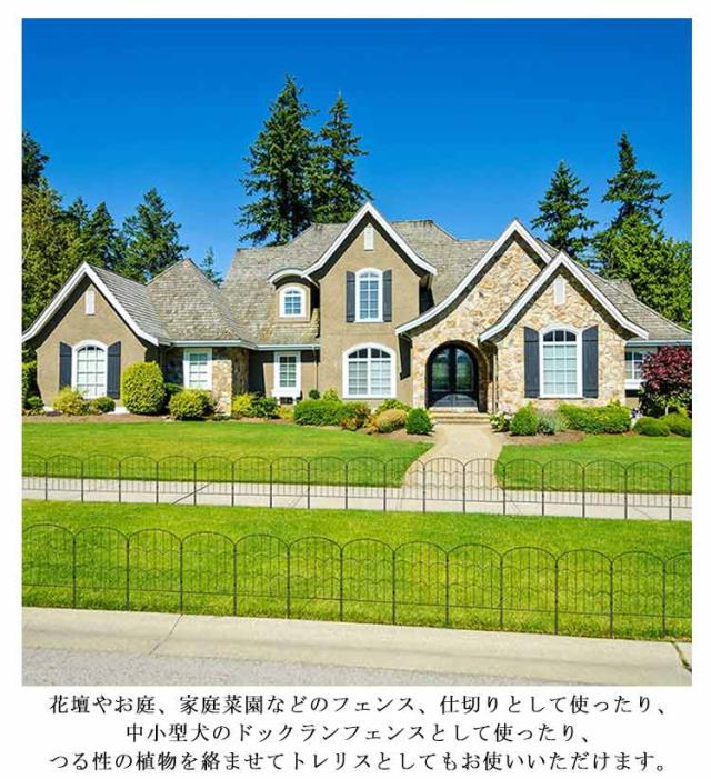 | 華やかで高級感のあるアイアンフェンス10枚セットです。【35*60cm】×10枚 見通しのいいアイアンフェンスは、お庭をすっきり広く見せますし、よりおしゃれに飾れます。 【耐久性に優れる】頑丈なアイアン製品、木製のものより経年劣化が少なです。防錆処理を施しているので、錆に強く、長くお使いいただけます。 【自由にアレンジ】ジョイントで連結式なので、お庭のサイズや形に合わせて何枚でも連結可能です。コの字やLの字型など、スペースに合わせて置き方は自由自在です。 【設置簡単】フェンスは組立て不要、地面に差し込むだけなので、設置が簡単です。きちんと地面に差し込めば、安定性もばっちりです。 【様々な用途】花壇やお庭、家庭菜園などのフェンス、仕切りとして使ったり、中小型犬のドックランフェンスとして使ったり、つる性の植物を絡ませてトレリスとしてもお使いいただけます。 | |