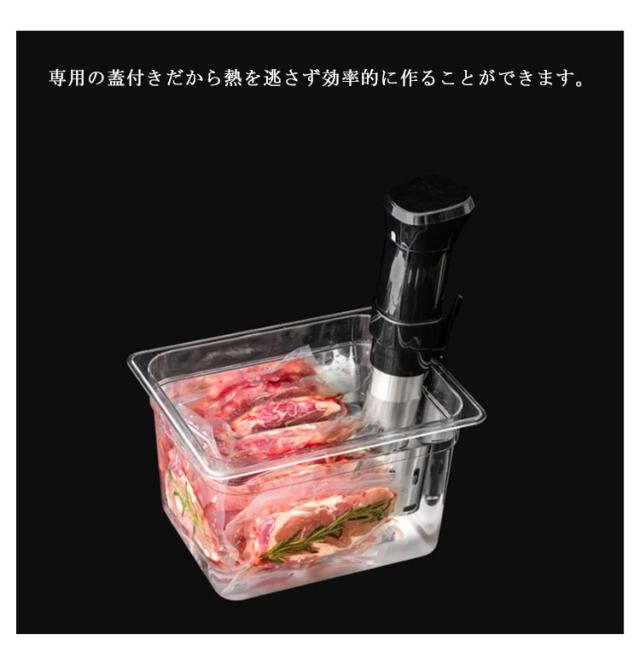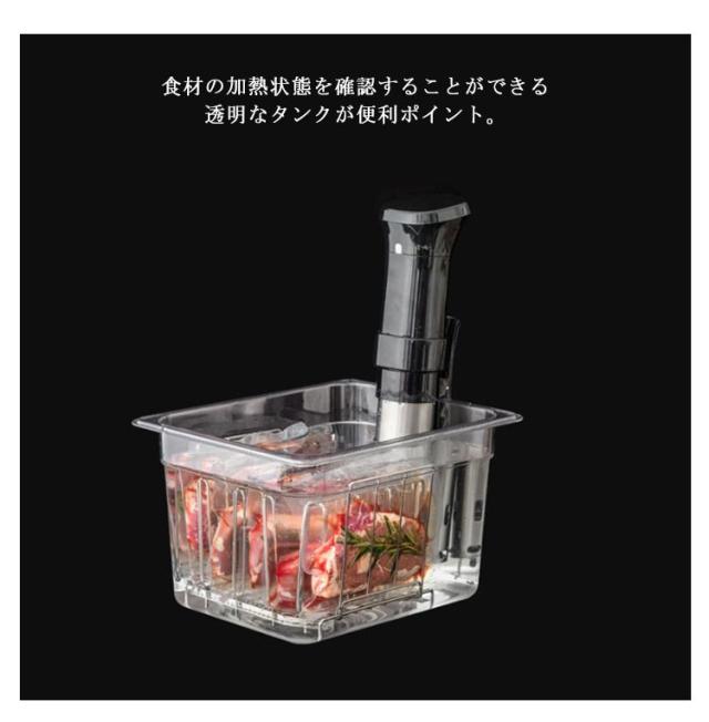 | 低温調理器専用タンク 11L 専用の蓋付きだから熱を逃さず効率的に作ることができます。 食材の加熱状態を確認することができる透明なタンクが便利ポイント。 | |
