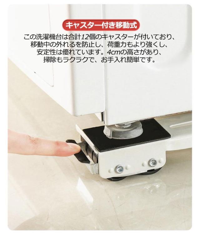 | 【利用簡単】組立いらないで、簡単に洗濯機などの大型家電を載せる洗濯機台です。静止時の安全性を確保するために、ロックできるのブレーキが設置し、押し下げて、迅速に静止させます。 【伸縮自在・楽に収納】長さは45.7cmから71.1cmまで自由に調節できます。家電のサイズによって様々な応用があります。また、使わない時は部屋のどの隅にも収納可能で、取り外しもしやすいです。 【キャスター付き移動式】この洗濯機台は合計12個のキャスターが付いており、移動中の外れるを防止し、荷重力もより強くし、安定性は優れています。4cmの高さがあり、掃除もラクラクで、お手入れ簡単です。 【滑り止め・防振減音】四隅に滑り止めマットが付属しています。移動時の安定性を強化する同時に、洗濯機を直接接触しなくて、作業中の振動防止も有効です。 【適用シーンが多い】300 kgの負荷に耐えられますので、多種類の家電製品に適用します。置き台の長さを調整して、洗濯機、エアコン、ソファー、本棚、タンスなど、いろいろな場合にお気軽に使えます。 | |