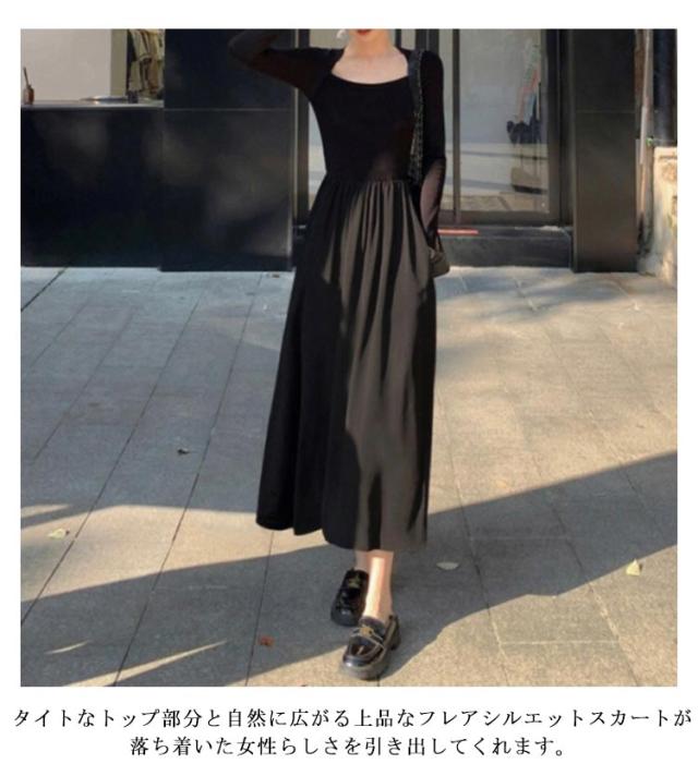 ドッキングワンピース ワンピース ドッキング 長袖 ロングワンピース 異素材 切り替え ワンピース 秋冬 春 スクエアネック ミモレ丈 ひざ下 秋新作 ワンピースドレス タイト 通勤 セクシー ハイウエスト スリム 細身 お出かけ お呼ばれ イベント デート