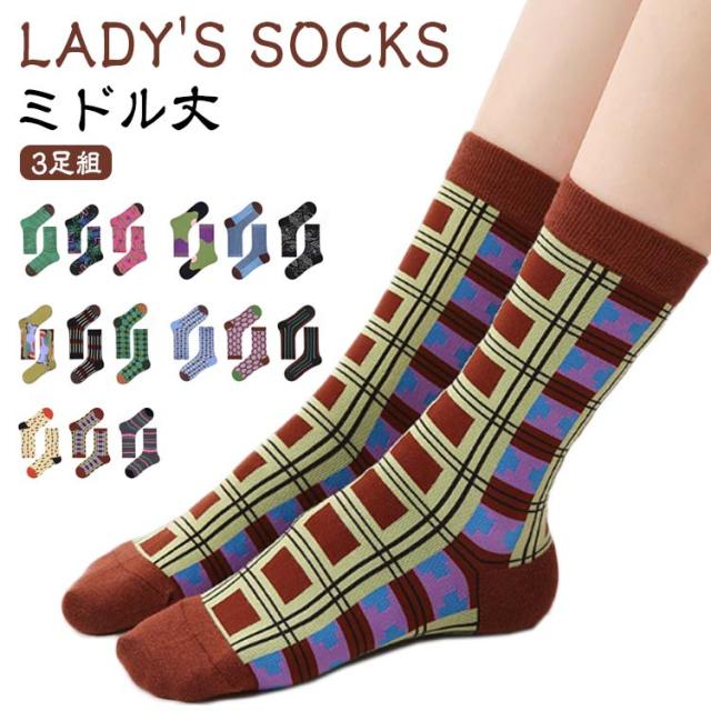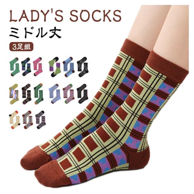 ヴィンテージ風 靴下 3足セット 靴下 北欧 ソックス 秋色 フラワー 花柄 靴下 ミドル丈 スニーカーソックス クルー丈 クルーソックス チェック柄 靴下 レディース おしゃれ ソックス くつした レトロ 靴下 送料無料