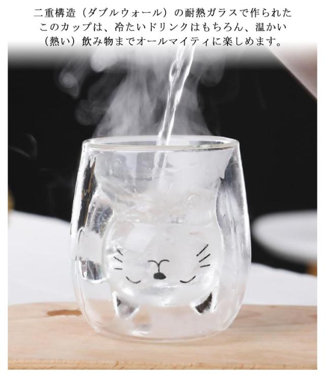 | しっかりとした安定のあるフォルムとなんとも言えない、かわいいお顔が魅力的のグラス。 二重構造(ダブルウォール)の耐熱ガラスで作られたこのカップは、冷たいドリンクはもちろん、温かい(熱い)飲み物までオールマイティに楽しめます。 2重構造はその名の通りガラスが二重になっているため、コップを持った手が熱くならずやけどの心配がありません。 また、表面には水滴を集めないため、コースターがなくてもテーブルの上を汚しません。 見ただけでも可愛いのに、飲み物をそそぐともっとカワイイ!おしゃれに映える(ばえる)写真を撮って、SNSにアップしちゃいましょう!ダイニングやリビング、自分のデスクに置いてあるだけでもインテリアとしてオシャレ。 | |
