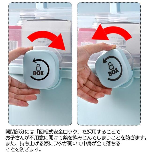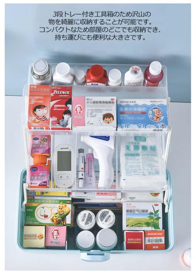 | 【大容量&コンパクトで収納便利】 【安心安全な造り】 【見やすく取り出しやすい】 【三段式家庭用薬箱は様々な需要にこたえます】 【多様な用途】 市販の薬収納ボックスや救急ボックス、工具箱よりはるかに大容量でおしゃれなた収納ケースです。 3段トレー付き工具箱のため沢山の物を綺麗に収納することが可能です。 コンパクトなため部屋のどこでも収納でき、持ち運びにも便利な大きさです。 開閉部分には「回転式安全ロック」を採用することでお子さんが不用意に開けて薬を飲みこんでしまうことを防ぎます。また、持ち上げる際にフタが開いて中身が全て落ちることを防ぎます。 フタは180度開閉タイプのため、どこに何をしまっているか一目で把握することができ緊急時でも直ぐに薬を取り出せます。 透明カバーのためフタを閉めた状態でも中身が一目瞭然です。 サイズLのは家庭での使用に最適です。部屋が狭い場合・収納する物が少ない場合・持ち運ぶことが多い場合は、サイズMに最適です。ご購入前に確認することをお薦めします。 薬箱以外にも、工具入れ、文具入れ、メイク道具入れ、おもちゃ箱、ソーイングボックス、ベイブレード ケース、釣具 収納、車載ボックス、ピットボックス、その他の様々な用途で活躍しています! | |