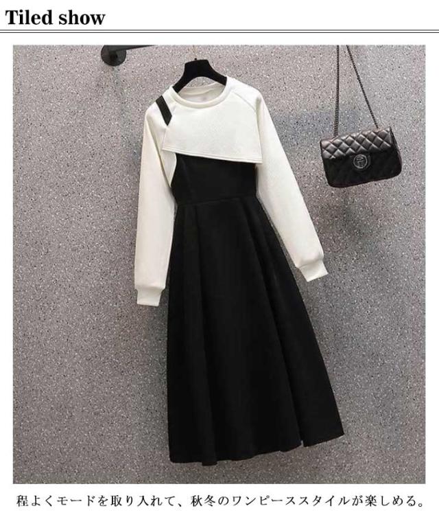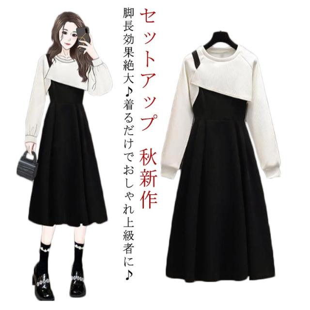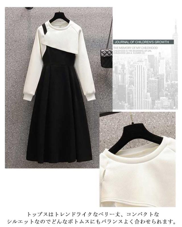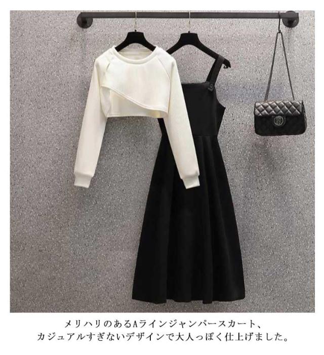 セットアップ 秋新作 ロング ジャンパースカート サロペットスカート ベリーショート スウェット トレーナー トップス 2点セット レディース フレア 体型カバー 森ガール 韓国ファッション 長袖 秋 冬