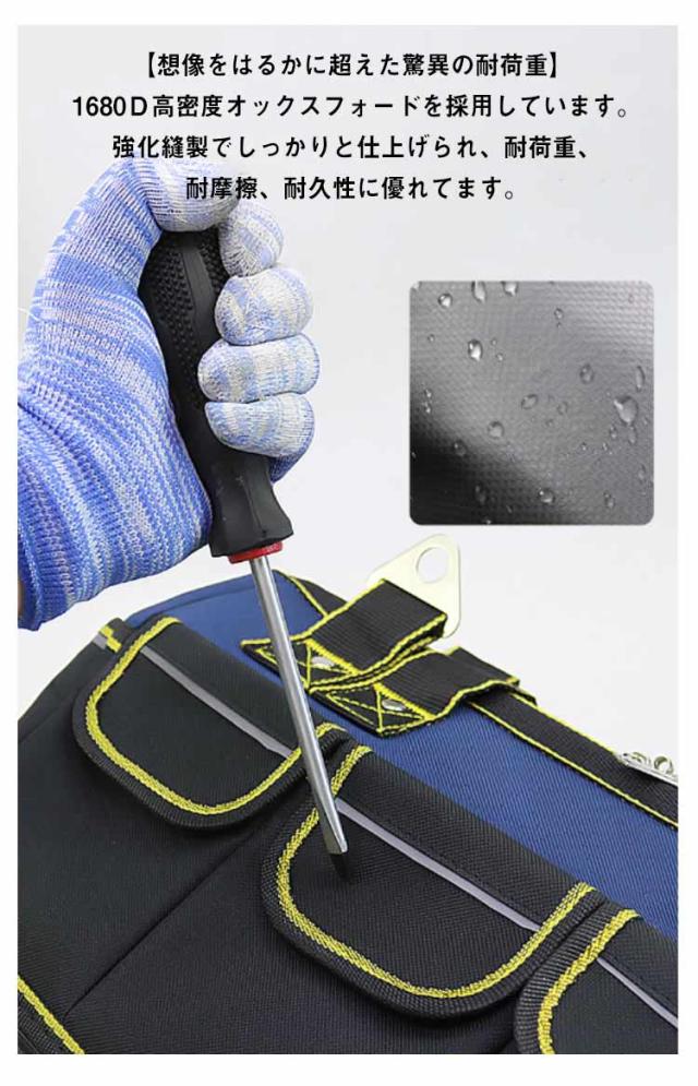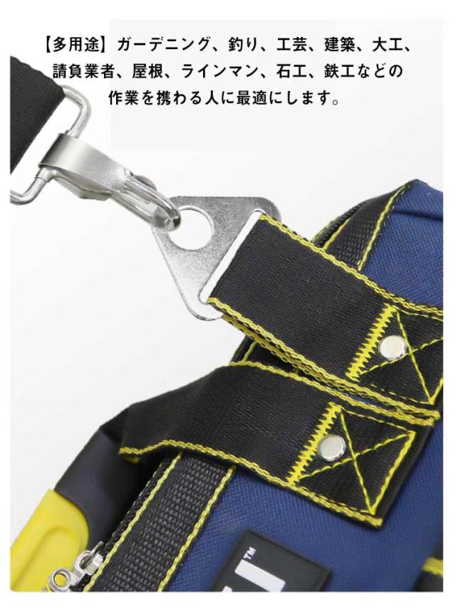 | 17インチ 肩掛けベルト付き 工具バッグ。 【想像をはるかに超えた驚異の耐荷重】 1680D高密度オックスフォードを採用しています。強化縫製でしっかりと仕上げられ、耐荷重、耐摩擦、耐久性に優れてます。 【強化底部 自立機能】 底部が強化PE製として作られます。高さがあり、直接地面と接しないので、底面が汚れにくくなっています。また自立機能は作業時などで立つことが必須になります。 【強化持ち手】持ち手部分はプラスチック製ハンドルを採用しているので、便利な握り心地で長時間持っていても手が痛くなりにくくなっています。 【多用途】ガーデニング、釣り、工芸、建築、大工、請負業者、屋根、ラインマン、石工、鉄工などの作業を携わる人に最適にします。日常生活のDIY活動だけでなく、自動車修理、木工および専門な修理活動も最適です。 | |