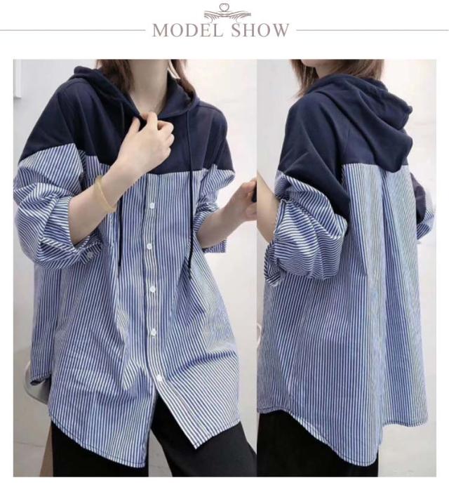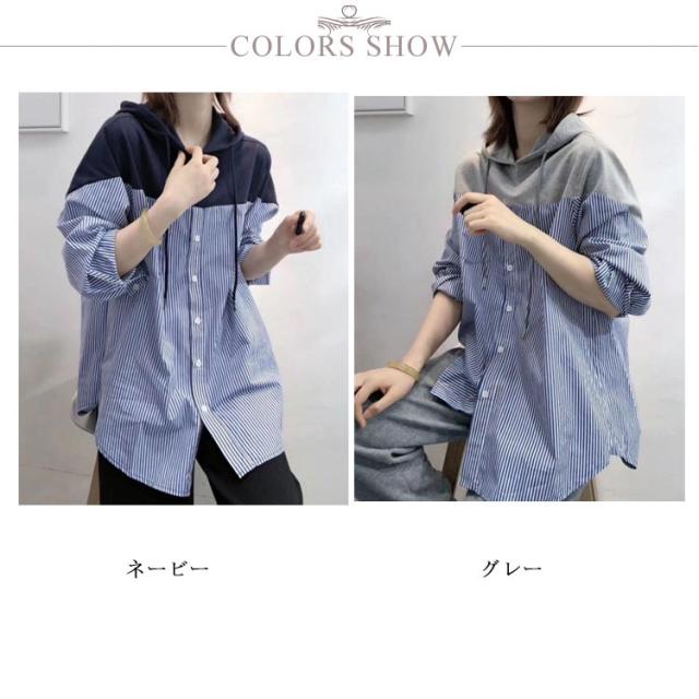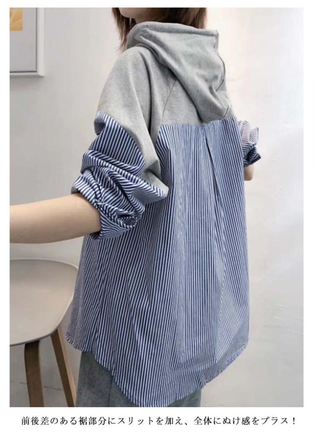 ストライプブラウス シャツ 送料無料 トップス ロングシャツ ストライプ柄 チュニック レディース 長袖 春夏 秋 フード付き パーカー 切替え 体型カバー プルオーバー きれいめ 大人可愛い 30代 40代