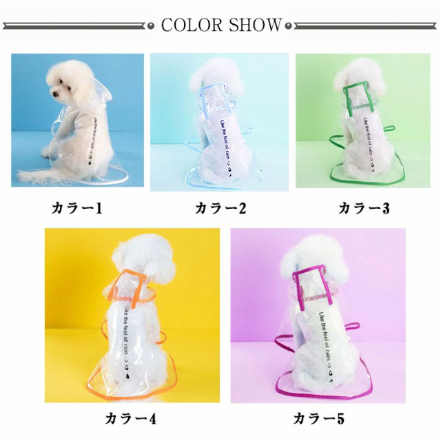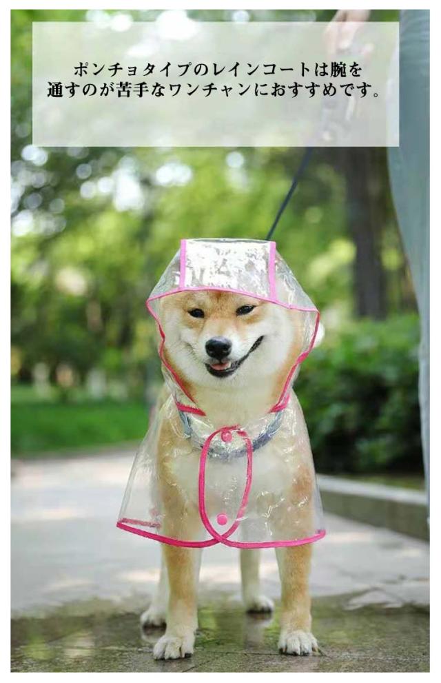| フード付きでしっかり頭をカバー。犬用透明レインコート。 ポンチョタイプのレインコートは腕を通すのが苦手なワンチャンにおすすめです。 パッと被せてマジックテープを止めるだけで簡単に着用できます。 簡単に装着できる、軽くて、折り畳んで収納できます。 雨の日はもちろん、寒さ対策に、風よけに、そして花粉よけにも、様々な用途で活躍です。 | |
