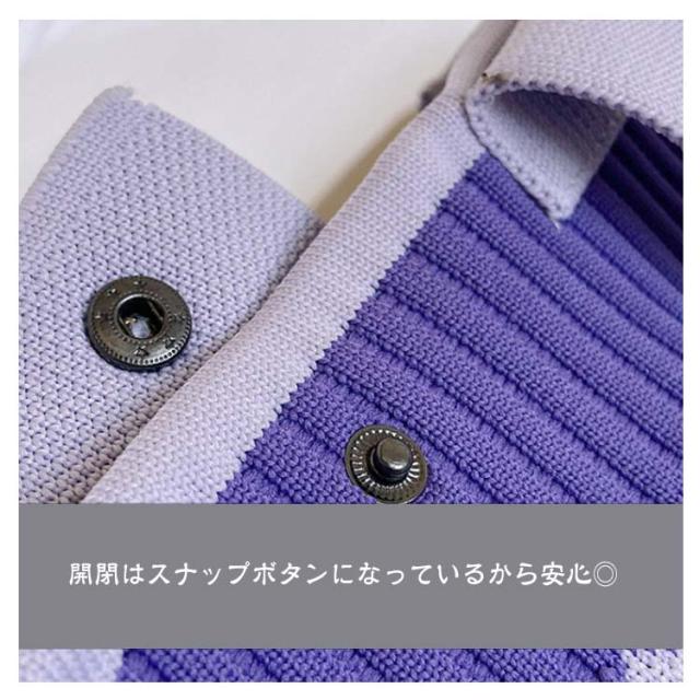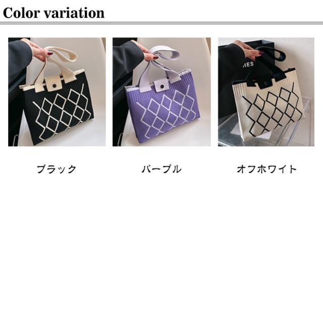 | 一つは持っておきたい!SNSで大人気のニットバッグ。 シンプルなスクエア型、モダンな柄がカジュアルからキレイめまで様々なスタイルにマッチ♪ コンパクトな見た目ながら、収納力も十分あり、お出かけや通勤などシーンにぴったり。 開閉はスナップボタンになっているから安心◎ 柔らかな素材でコンパクトに折りたためるので、サブバッグとしてカバンに入れておいても◎ | |