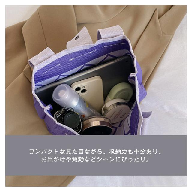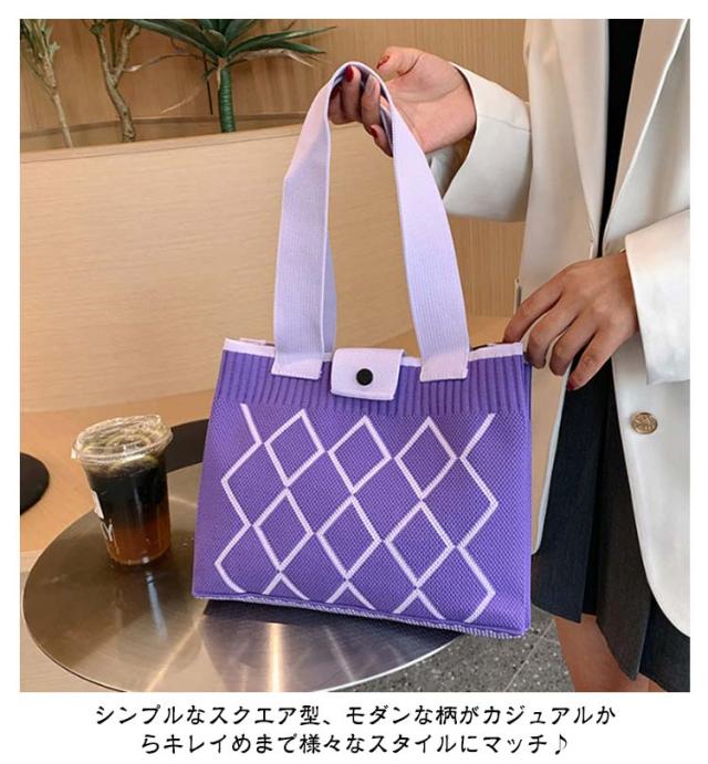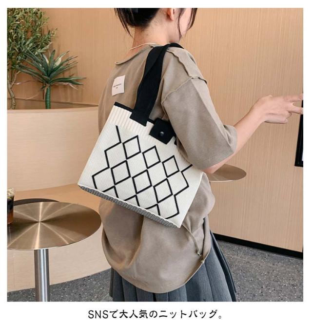 ニットバッグ 肩掛けバッグ トートバッグ スクエアバッグ 韓国 ミニトート ハンドバッグ ワンショルダー ニット編みバッグ エコバッグ マチあり 幾何学模様 ボタンで開閉 大容量 軽量 お出かけ 通勤 可愛い 肩掛け おしゃれ