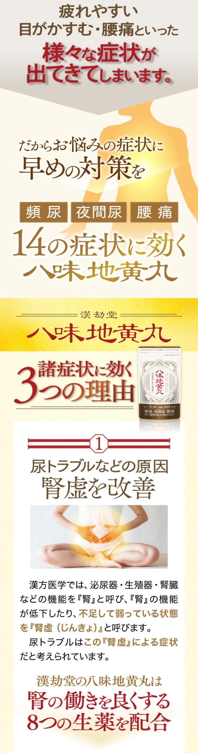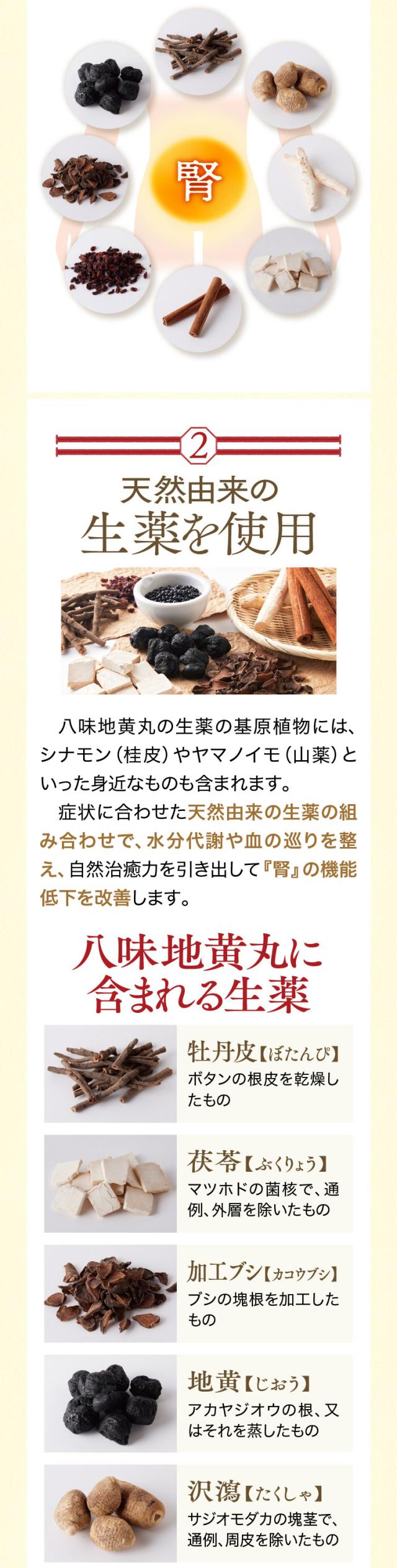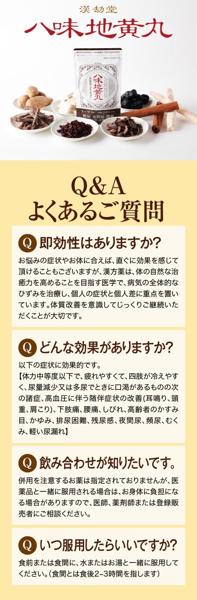 | 成分・分量 | 本剤1日量30粒中に、次の生薬が含まれています。 地黄(ジオウ)末・・・1,026mg 山薬(サンヤク)末・・・513mg 茯苓(ブクリョウ)末・・・513mg 山茱萸(サンシュユ)末・・・513mg 沢瀉(タクシャ)末・・・513mg 牡丹皮(ボタンピ)末・・・513mg 桂皮(ケイヒ)末・・・171mg 加工ブシ(力コウブシ)末 ・・・85mg 添加物としてハチミツを含有 |