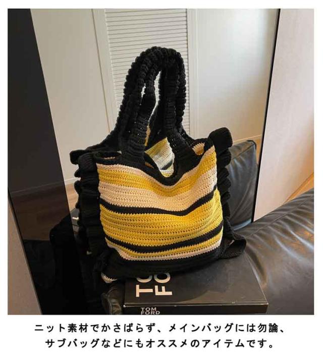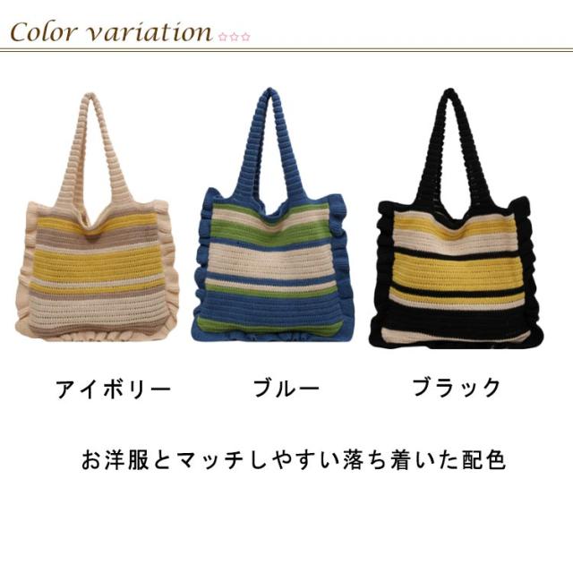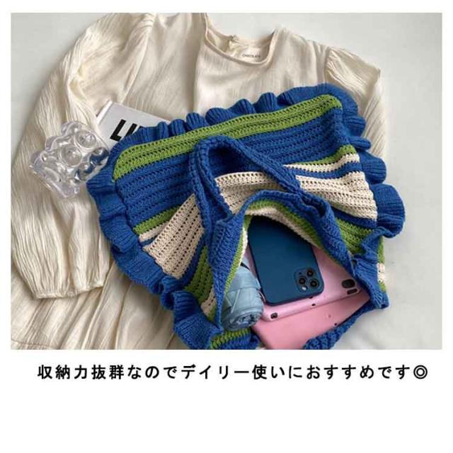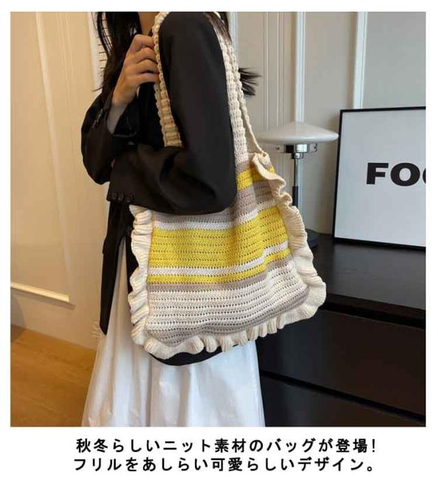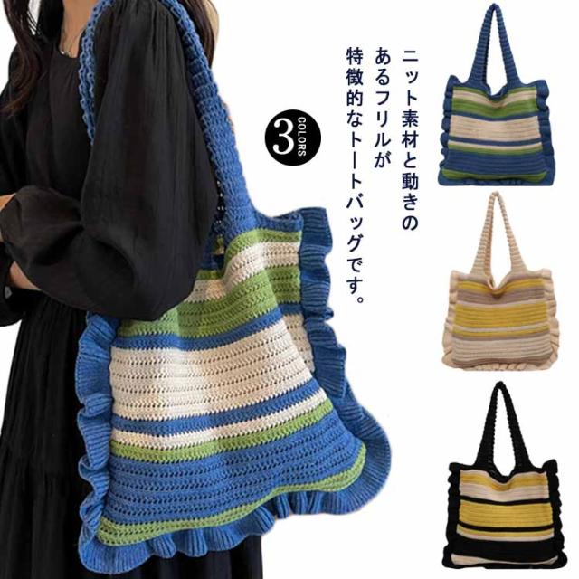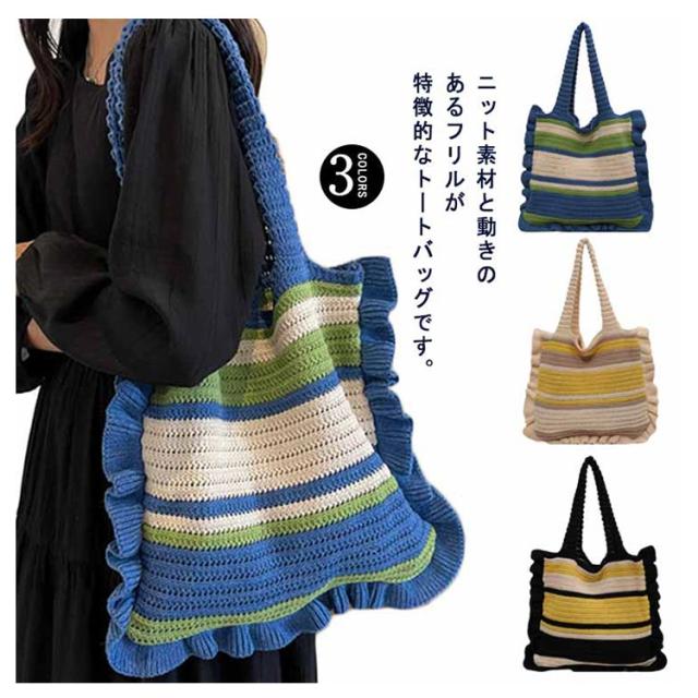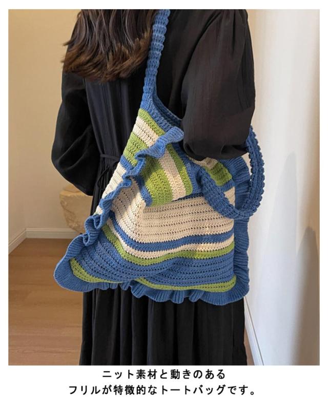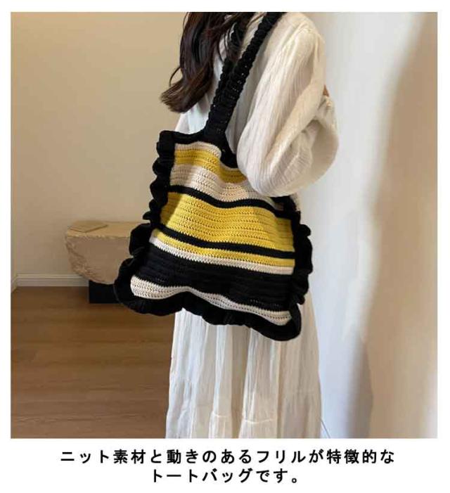 ニット トートバッグ フリル 配色 ボーダー柄 ニットバッグ 肩掛け ニットトート セーター風 A4 大きめ 大容量 レディース 秋 冬 ニット バッグ 軽い 軽量 エコバッグ 韓国 カジュアル 通勤 通学 学生 可愛い おしゃれ 【送料無料】