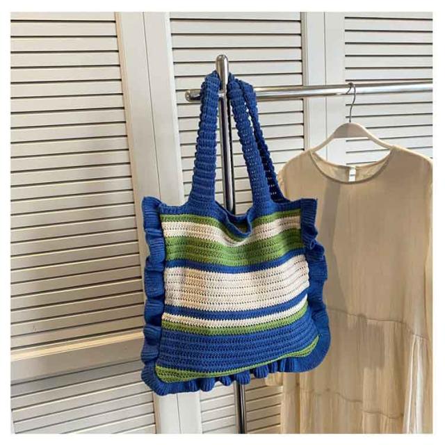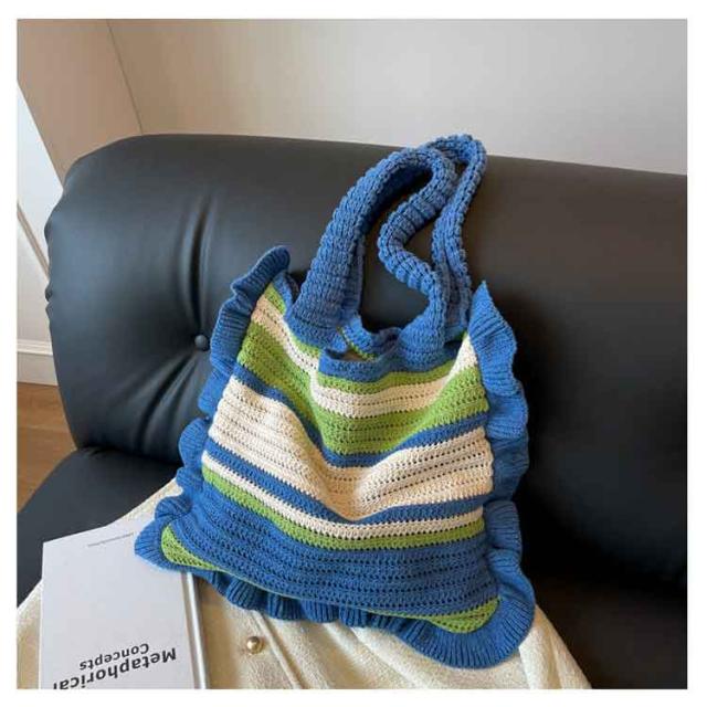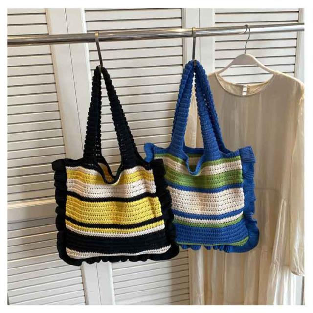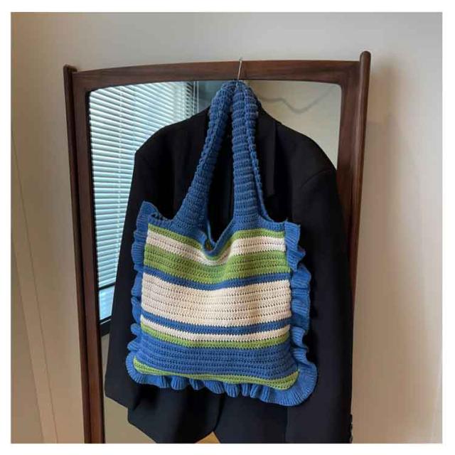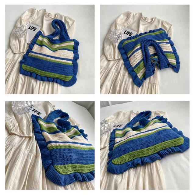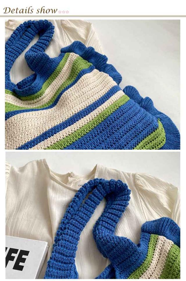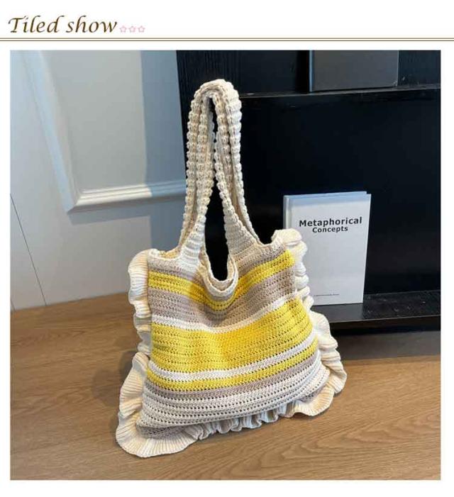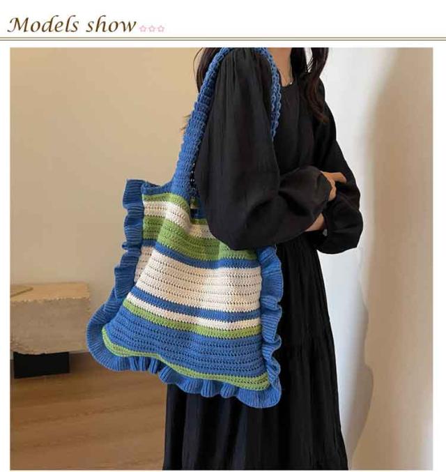 ニット トートバッグ フリル 配色 ボーダー柄 ニットバッグ 肩掛け ニットトート セーター風 A4 大きめ 大容量 レディース 秋 冬 ニット バッグ 軽い 軽量 エコバッグ 韓国 カジュアル 通勤 通学 学生 可愛い おしゃれ 【送料無料】