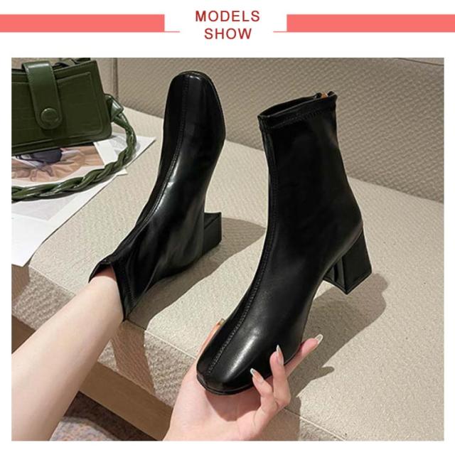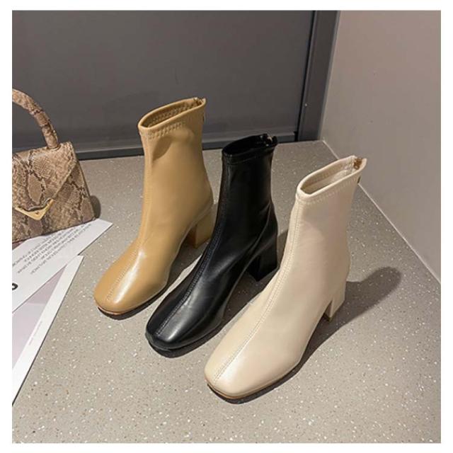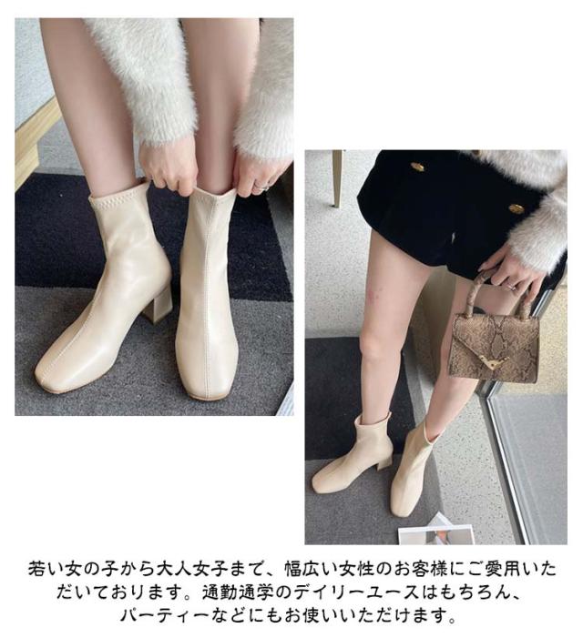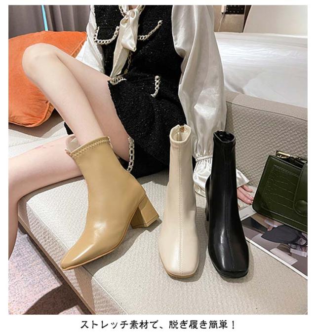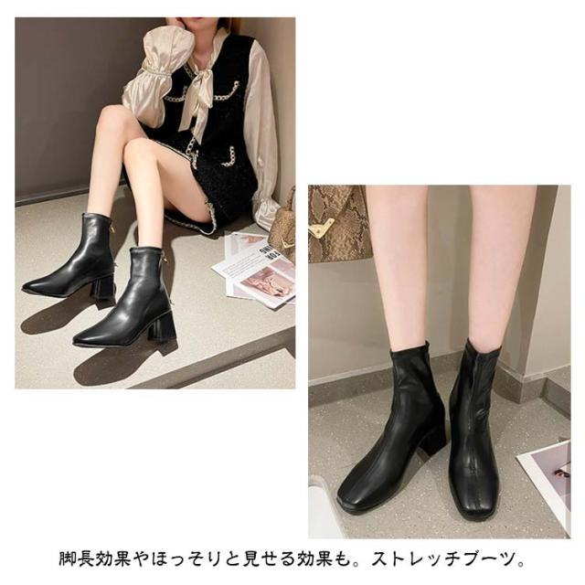 ショートブーツ レディース 歩きやすい スクエアトゥ ストレッチブーツ ミドルブーツ バックファスナー 美脚 ヒール6cm 太ヒール 身長アップ 靴 通勤靴 韓国ファッション 疲れない 痛くない 走れるブーツ