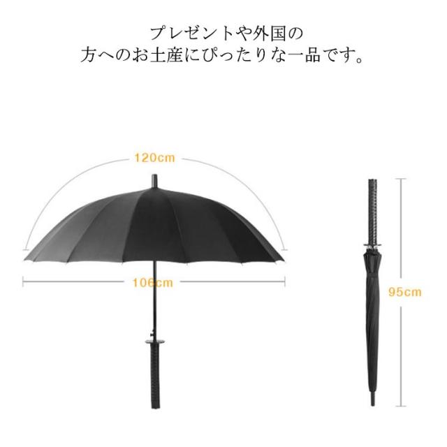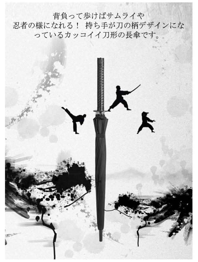 | 大人気のため入荷!これは目立つ! 雨の日も楽しく過ごそうサムライ刀傘で! 背負って歩けばサムライや忍者の様になれる! 持ち手が刀の柄デザインになっているカッコイイ刀形の長傘です。 軽くてしなやかで丈夫な素材を採用した16本親骨が作り出す、円に近い美しいフォルムは強い風にも負けない耐久性を実現しました。 風を受けても折れにくい安定感があり、骨が多くてもより軽量で持ち歩きやすい 傘を閉じて収納ケースに入れた様子はまるで日本刀!柄や鍔もしっかり作られているので、ケースから出す時は思わず刀を抜くような格好をしたくなってしまうかも! 16本の骨組がつくる美しい円と、繊細な骨組はまるで和傘・番傘のようなフォルムで、日本らしい和風のデザインとなっています。 プレゼントや外国の方へのお土産にぴったりな一品です。 | |