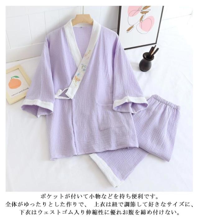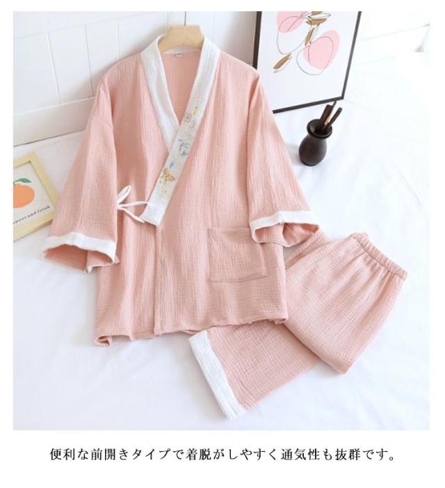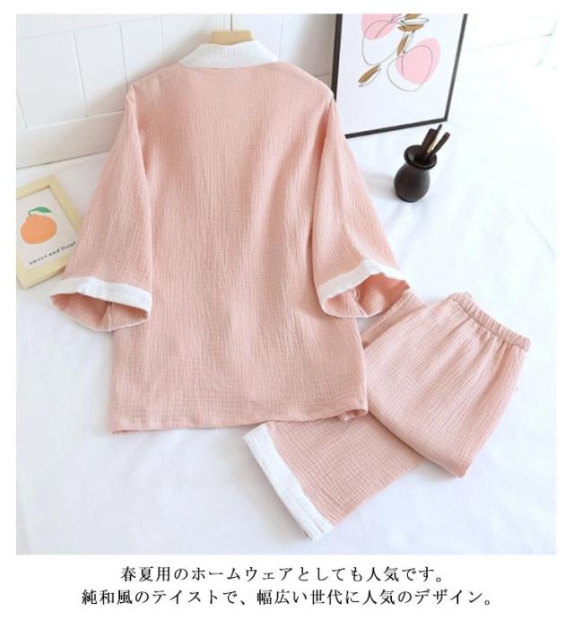 ガーゼパジャマ ねまき レディース ルームウェア 和風 甚平 浴衣 二重 ガーゼ 前開き 五分袖 通気性 吸汗吸湿 綿 コットン 女性 寝間着 部屋着 作務衣 お風呂 旅館 浴衣 ホテル 上下セット 春 夏 秋