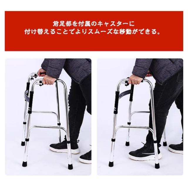 | 【高さ8段調節】【キャスター付き】【折り畳み】 ●室外・室内での歩行、立ち上がりをサポートする多機能歩行器。 ●高さ最大8段階調節可能 身長・体勢に合わせて8段階まで調節が可能。 ロックでしっかり固定できるから体重をかけても安心。 ●滑りにくいグリップ グリップ部は独自の形状で滑りにく、くしっかり握れる軟質素材を使用。 ●2way仕様、歩行に合わせて様々な使い方が可能 ・標準時はしっかり固定されているため、歩行・立ち上がり時も抜群の安定感。 ・前足部を付属のキャスターに付け替えることでよりスムーズな移動ができる。 ●上部にあり折畳みロックを押しただけで、簡単に折畳みすることが可能。女性や年寄りの方でも簡単に組立できる歩行器です。 ●【耐久性&安定性】 錆びにくいアルミ合金材質を使用、約100KGの高耐荷重。滑り止め仕様脚部を使用、優れな安定性を持つ、より滑り転倒にくいの安全な歩行器。 | |