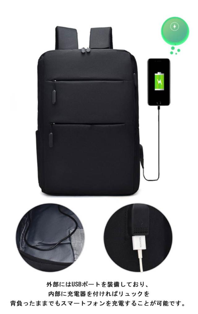 | 背負ったままusb機器使用可能♪外付けusb充電ポート付きリュックサック。 洗練されたシンプルなデザイン、男女問わず使用できます。 小物整理に便利なポケットが多数あり、コンパクトな見た目ながら大容量!物の整理・整頓しやすい。 外部にはUSBポートを装備しており、内部に充電器を付ければリュックを背負ったままでもスマートフォンを充電することが可能です。 | |