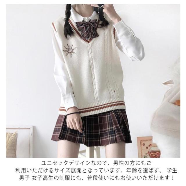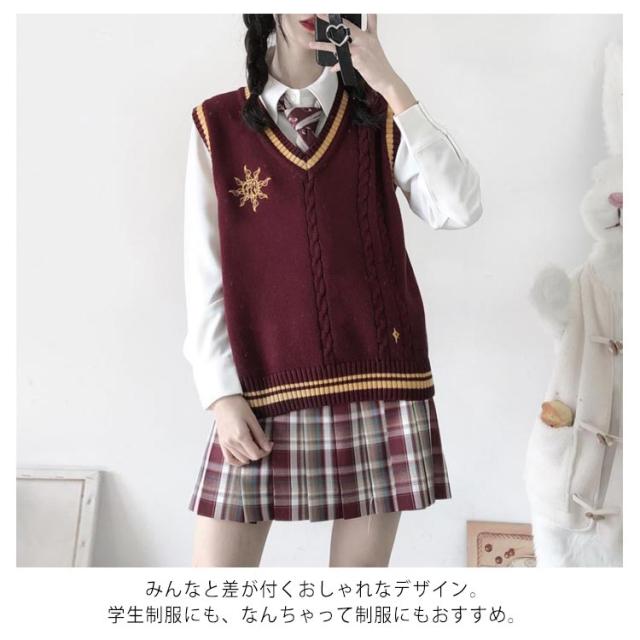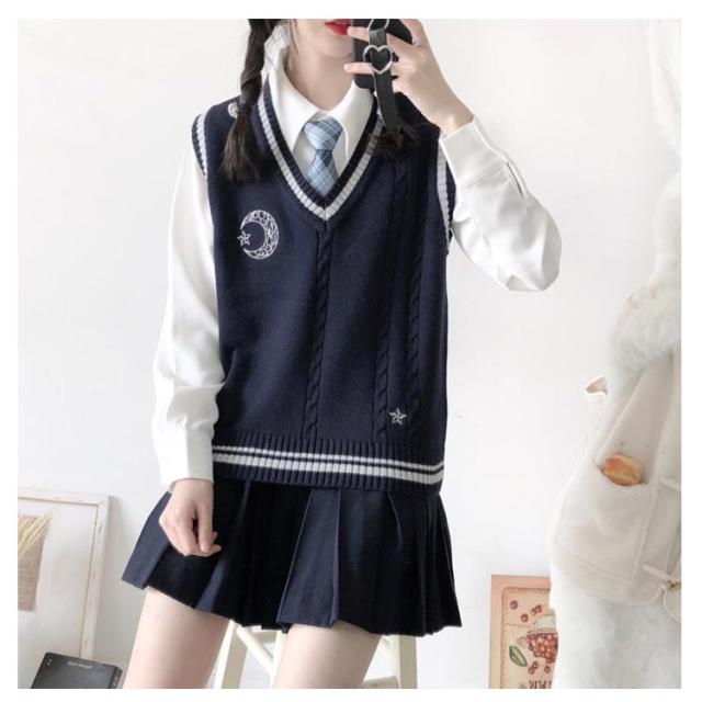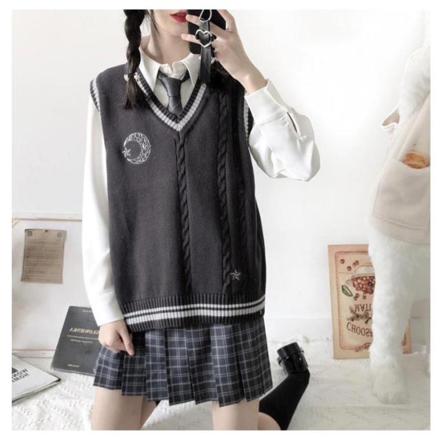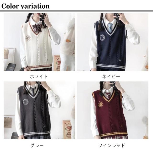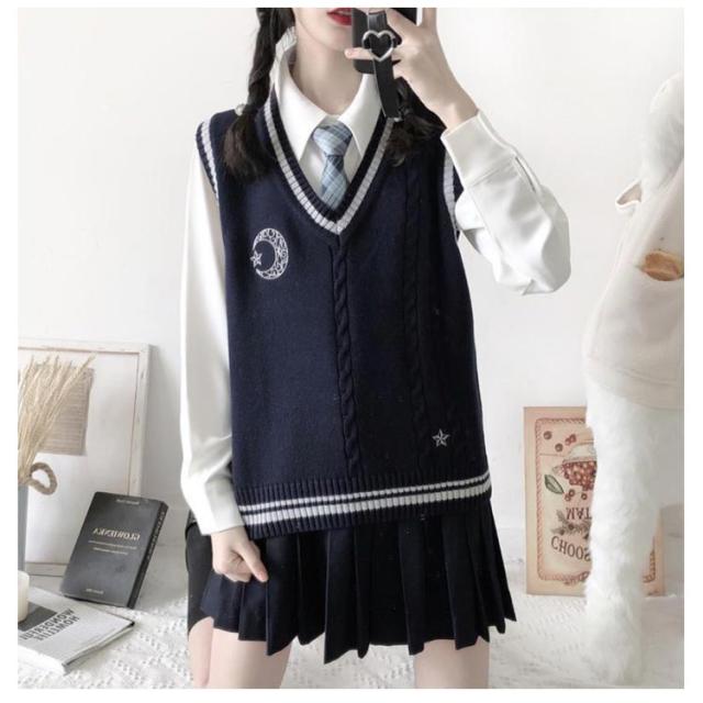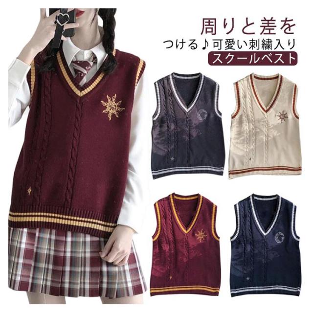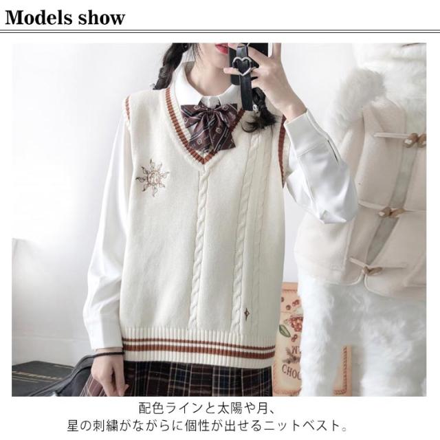 スクール ベスト ライン入り Vネック ニットベスト ケーブル 月 太陽 星 刺繍 可愛い 韓国 JK 制服 学生服 レディース 女子高生 高校生 学生服 学園祭 入学式 卒業式 男女兼用 高校 中学 通学 ニット コスチューム イベント