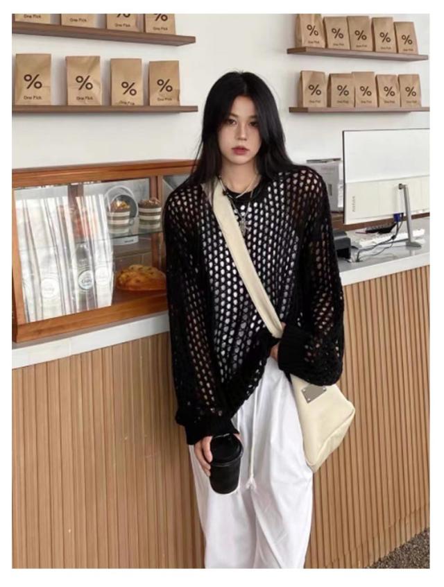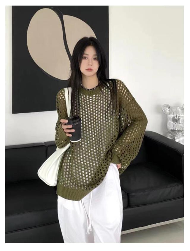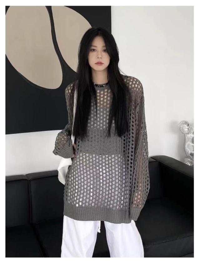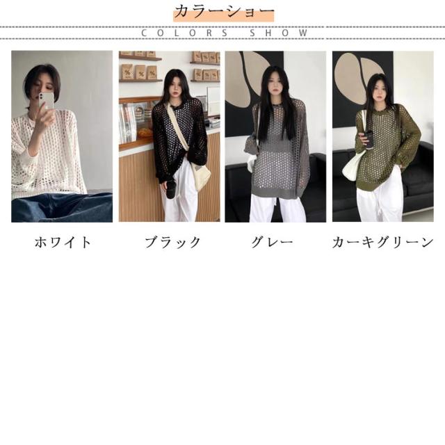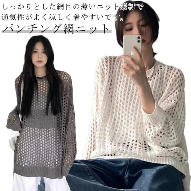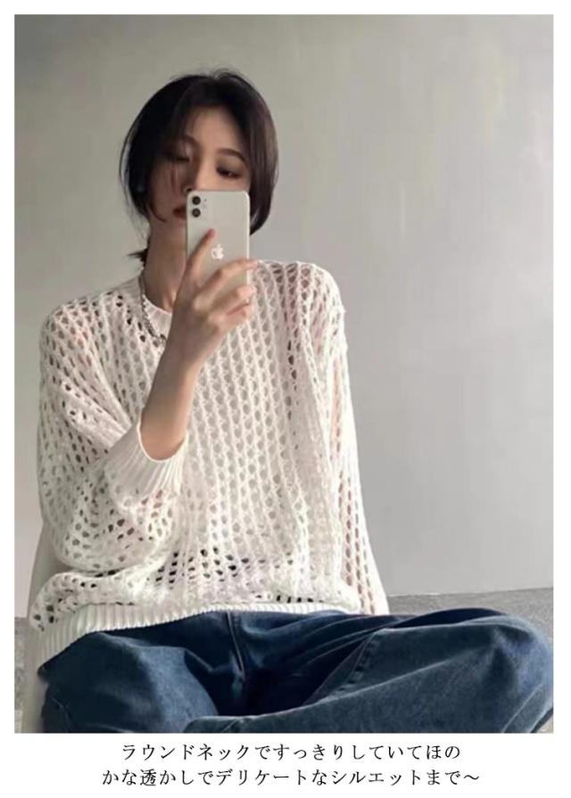 ニット レディースファッション 韓国ファッション メッシュニット 夏ニット 秋 ラウンドニット シースルーニット パンチングニット ひらひらとしたムード