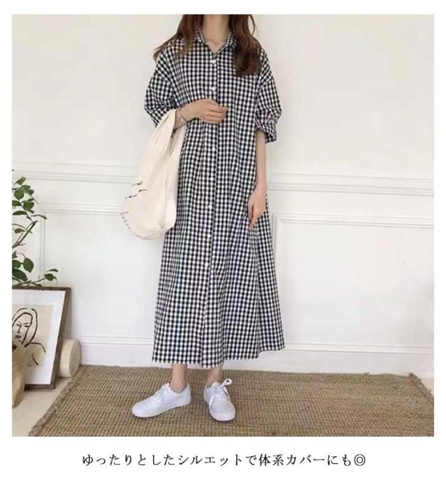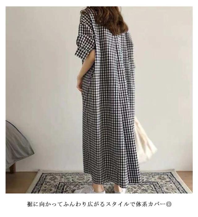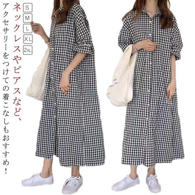 シャツワンピース レディース ミモレ丈 袖あり 半袖 シャツ ゆったり 裾スリット有 ポケット 大人可愛い シンプル カジュアル 上品 大人女子 こなれ感 存在感 レディース ママ 女の子 OL 通勤 ギンガムチェック