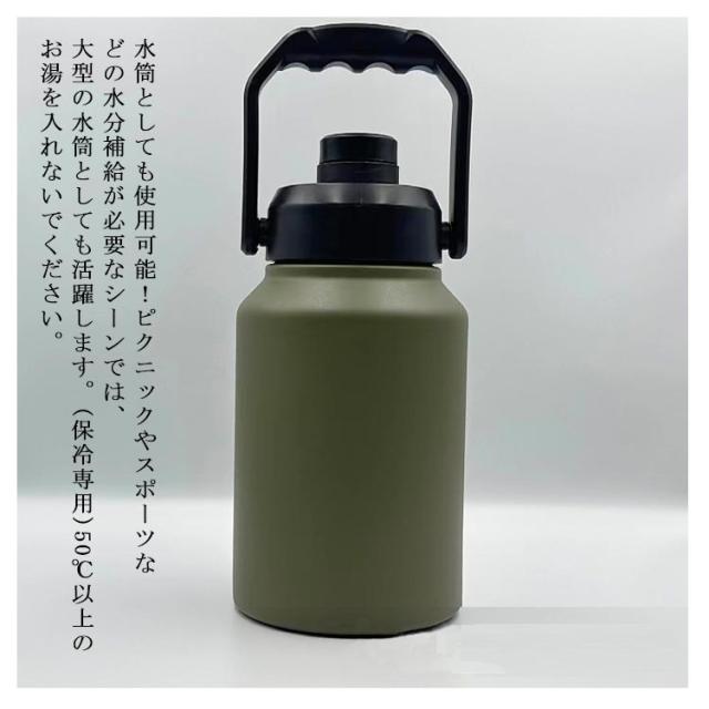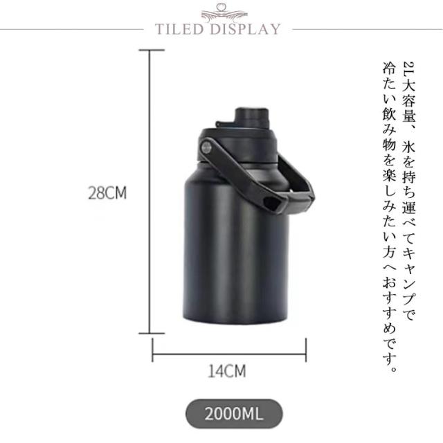 | 保冷専用 2L ウォータージャグ 大きさな氷が入る広口設計で、氷が出し入れしやすい。 外気の熱の影響を受けにくい真空二重構造、長時間氷をキープします。 2L大容量、氷を持ち運べてキャンプで冷たい飲み物を楽しみたい方へおすすめです。 「ロック付きの飲み口」や「滑り止めラバー」「大型ハンドル」など、使いやすさを考慮した機能が携わっています。 水筒としても使用可能!ピクニックやスポーツなどの水分補給が必要なシーンでは、大型の水筒としても活躍します。(保冷専用)50℃以上のお湯を入れないでください。 | |