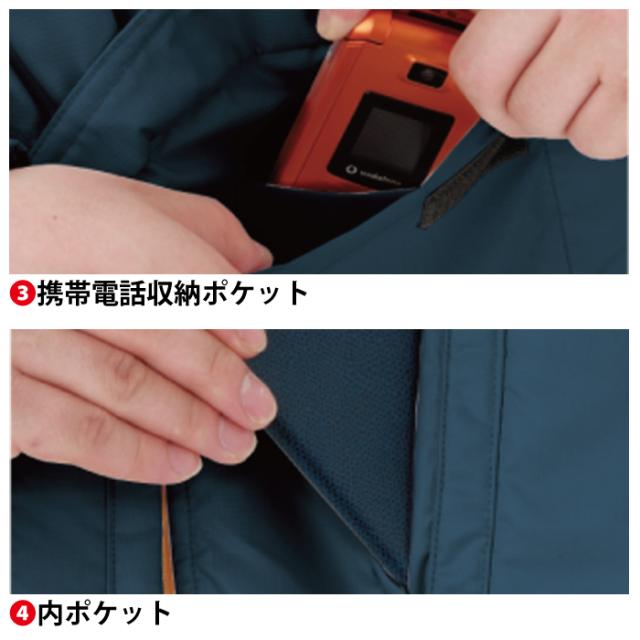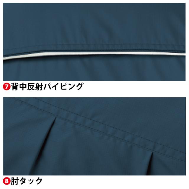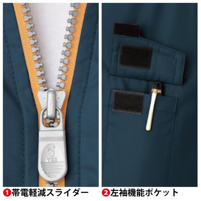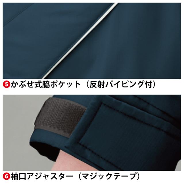 ◇帯電軽減スライダー・左袖機能ポケット・携帯電話収納ポケット・内ポケット・かぶせ式脇ポケット(反射パイピング付)・袖口アジャスター(マジックテープ)・背中反射パイピング・肘タック・樹脂ドットボタン・フード取り外し可・JIS T8118規格合格仕様