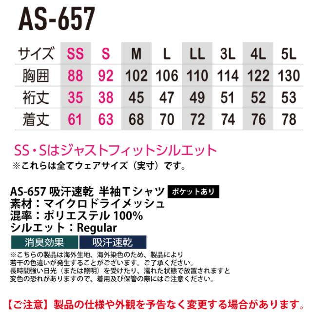 AS-657 吸汗速乾半袖Tシャツ ポケットあり