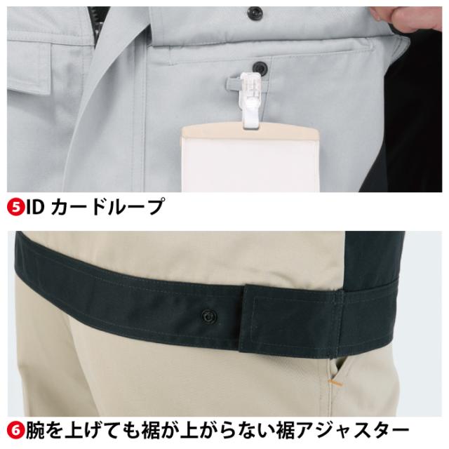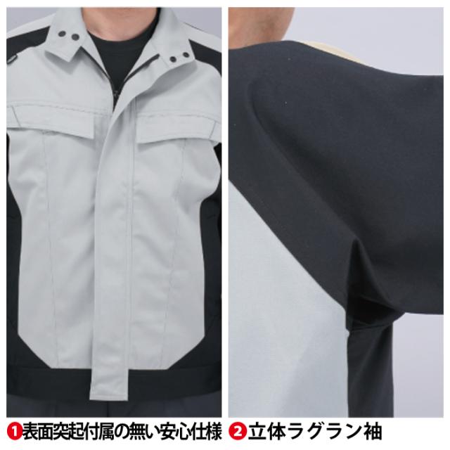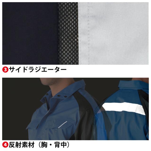 ◇帯電防止素材使用・表面突起付属の無い安心仕様・立体ラグラン袖・サイドラジエーター・反射素材(胸・背中)・IDカードループ・腕を上げても裾が上がらない裾アジャスター・樹脂ドットボタン・樹脂ファスナー・男女兼用