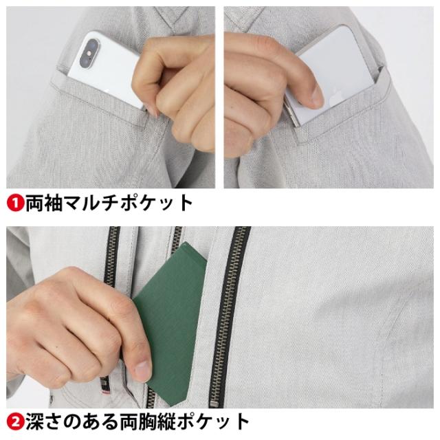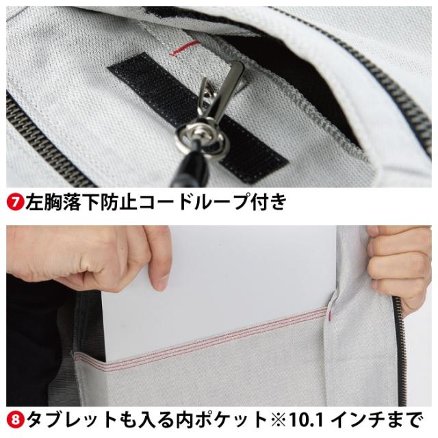 ◇両袖マルチポケット・深さのある両胸縦ポケット・両脇マルチポケット・サイドベンツアジャスター・反射パイピング(背中・両袖)・アーマーパッド・左胸落下防止コードループ付・タブレットも入る内ポケット(10.1インチまで)・野帳が入るポケット・男女兼用