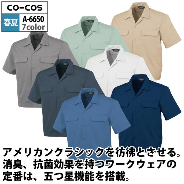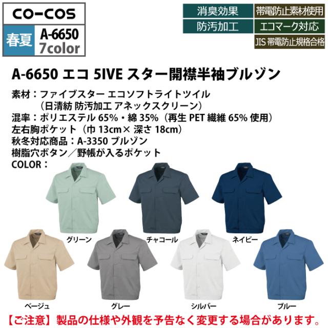コーコス 作業服 春夏用 A-6650 エコ5IVEスター開襟半袖ブルゾン EL