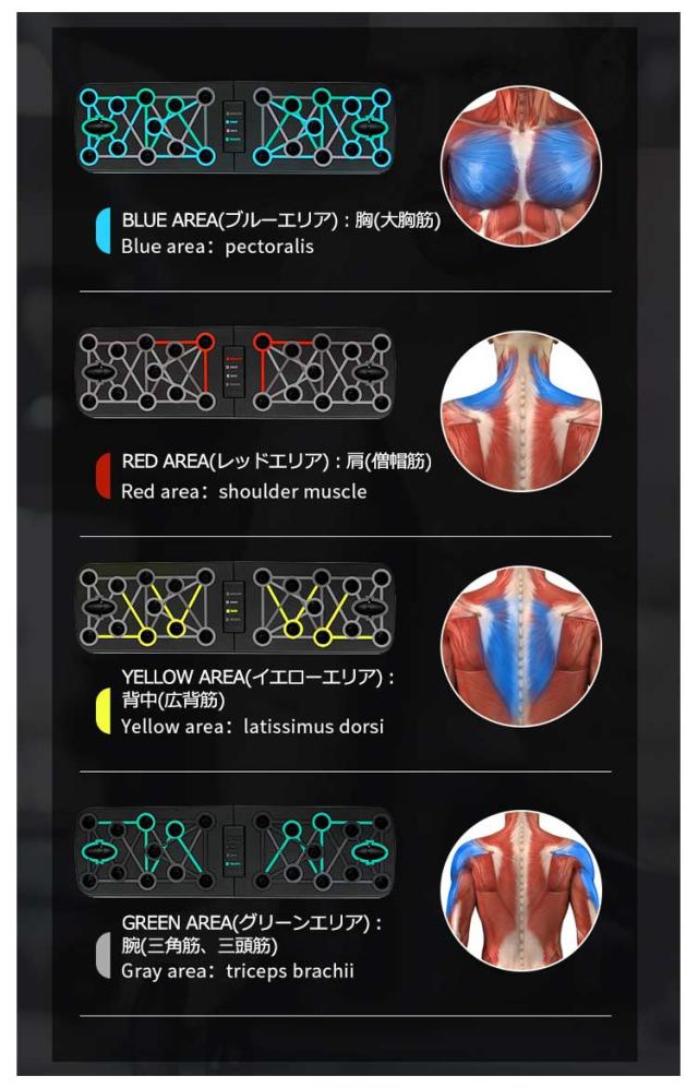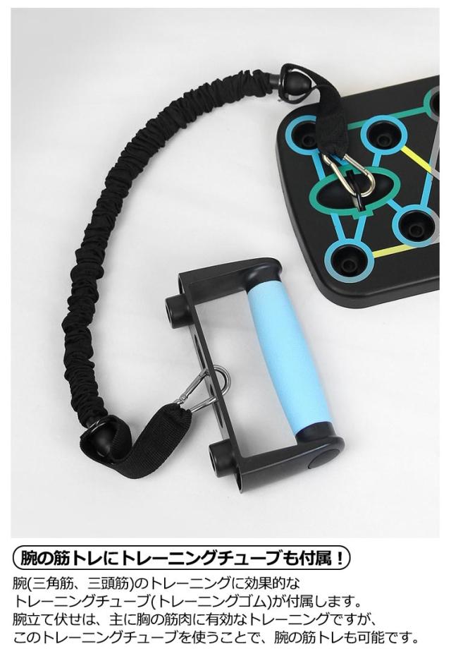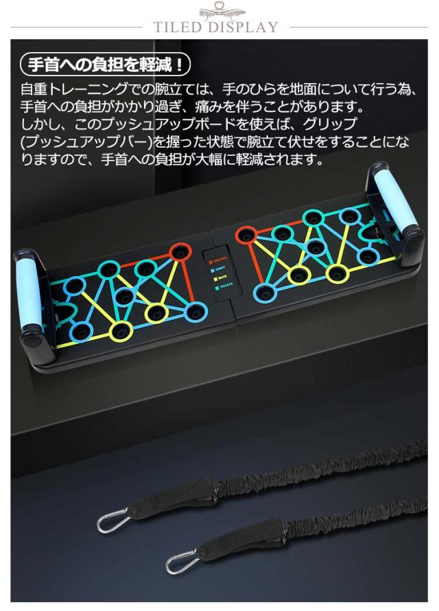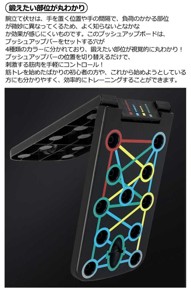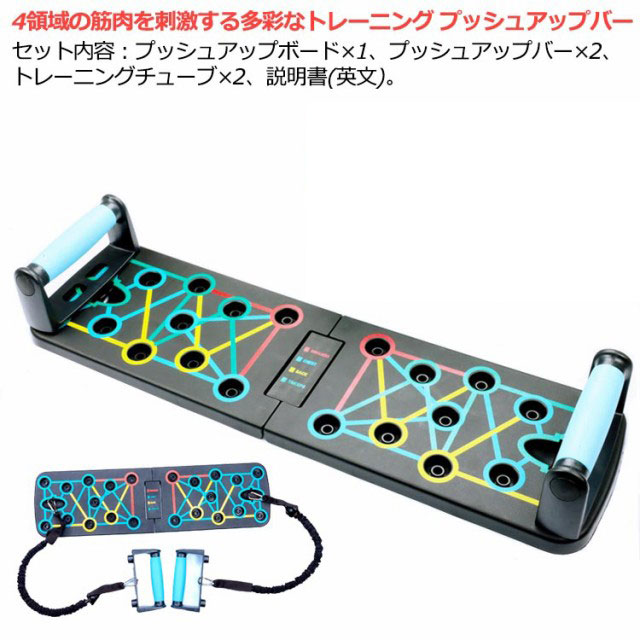 | セット内容:プッシュアップボード×1、プッシュアップバー×2、トレーニングチューブ×2、説明書(英文)。 4領域の筋肉を刺激する多彩なトレーニング プッシュアップバー 【手首への負担を軽減!】自重トレーニングでの腕立ては、手のひらを地面について行う為、手首への負担がかかり過ぎ、痛みを伴うことがあります。しかし、このプッシュアップボードを使えば、グリップ(プッシュアップバー)を握った状態で腕立て伏せをすることになりますので、手首への負担が大幅に軽減されます。 【鍛えたい部位が丸わかり】腕立て伏せは、手を置く位置や手の間隔で、負荷のかかる部位が微妙に異なってくるため、よく知らないとなかなか効果が感じにくいものです。このプッシュアップボードは、プッシュアップバーをセットする穴が4種類のカラーに分かれており、鍛えたい部位が視覚的に丸わかり! プッシュアップバーの位置を切り替えるだけで、刺激する筋肉を手軽にコントロール! 筋トレを始めたばかりの初心者の方や、これから始めようとしている方にも分かりやすく、効率的にトレーニングすることができます。 BLUE AREA(ブルーエリア):胸(大胸筋) RED AREA(レッドエリア):肩(僧帽筋) YELLOW AREA(イエローエリア):背中(広背筋) GREEN AREA(グリーンエリア):腕(三角筋、三頭筋) 【腕の筋トレにトレーニングチューブも付属!】腕(三角筋、三頭筋)のトレーニングに効果的なトレーニングチューブ(トレーニングゴム)が付属します。腕立て伏せは、主に胸の筋肉に有効なトレーニングですが、このトレーニングチューブを使うことで、腕の筋トレも可能です。 【手に馴染むグリップ】プッシュアップバーはグリップ部分をラバーコーティングして滑りにくい設計となっております。手が滑ってしまっては、手首を痛めてしまう可能性も有り、せっかく手首への負担が軽減されても意味がありません。しっかりと握ることで、筋肉への刺激に集中してトレーニングを行う事が可能です。 【コンパクトに収納可能】使用後は半分に折りたたんで、コンパクトに収納することが可能です。旅行先、出張先のホテルや、遠征先の合宿所など、部屋に持ち込む際に嵩張りません。また、公園などちょっとした広場があれば、どこにでも持ち運ぶ事ができるので、欠かさずトレーニングすることができます。 | |