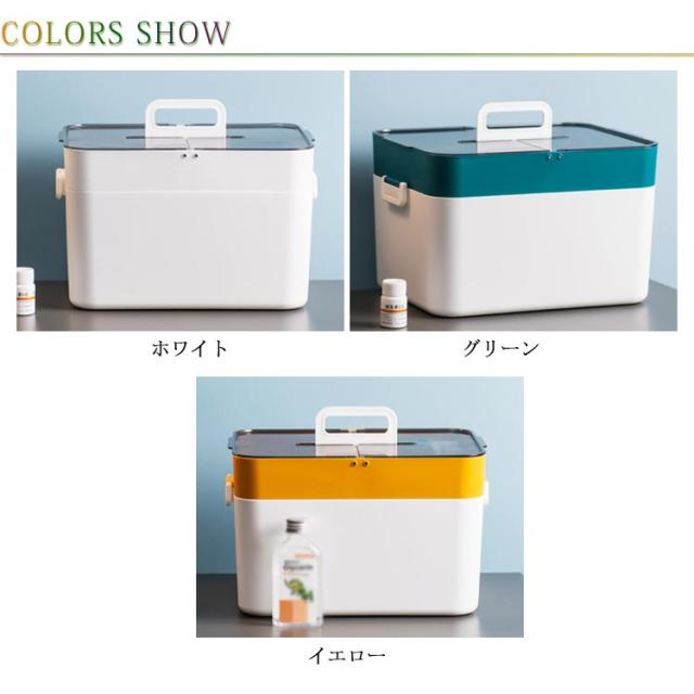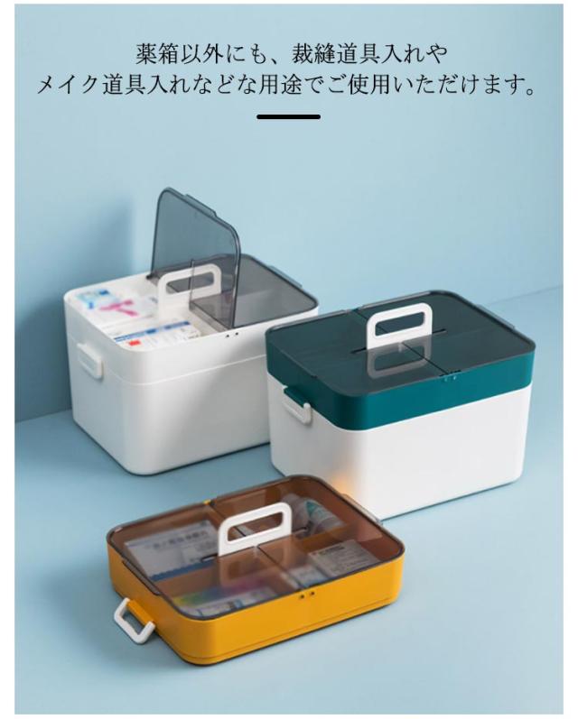 | 薬の箱を1つの救急ボックスにまとめて便利。 高品質なプラスチックを使用し、防塵・防湿効果があり、長くお使いいただけます。 大容量・おしゃれ、適当なサイズとロゴのないデザインが相まって、お部屋どこに置いても違和感がありません。 セパレートタイプで、すぐ使いたい物を上の段、あまり使わない物を下の段に入れて、整理整頓。(別々使用も可能) 上段には仕切りがあり、薬などの小物をはっきりと分類することができます。 下段には十分な高さがあり、背の高い薬も縦置きOK。 安心な両側ダブルロック設計、不用意な開閉が心配不要です。 しっかり閉まるので、持ち上げる際にフタが開いて中身が全て落ちることを防ぎます。 薬箱以外にも、裁縫道具入れやメイク道具入れなどな用途でご使用いただけます。 | |