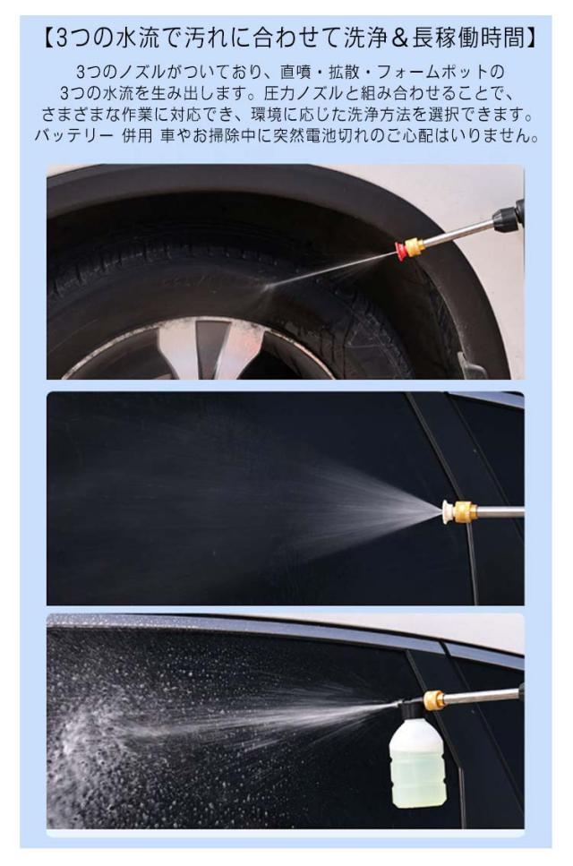 | 【13点セット】 【48VF バッテリー2個付+充電器 コードレス充電式高圧洗浄機】 【大容量バッテリー】大容量の高出力・高耐久モーターユニット搭載しており、電圧21Vでコードレスでもハイパワーが長時間持続できるコードレスハイパワー強水圧洗浄機です。 【手軽に使えるコードレス】取り回しが良い充電式コードレス高圧洗浄機なので、電源がない場所でも使用可能です。バケツなどに入れた水をくみ上げる吸水タイプで、専用タンクがないので場所を選ばず使えます。 【3つの水流で汚れに合わせて洗浄&長稼働時間】3つのノズルがついており、直噴・拡散・フォームポットの3つの水流を生み出します。圧力ノズルと組み合わせることで、さまざまな作業に対応でき、環境に応じた洗浄方法を選択できます。バッテリー 併用 車やお掃除中に突然電池切れのご心配はいりません。 【使用シーン】車やバイク、自転車などの洗車、ベランダ・浴室・外壁の掃除やコケ落とし、ガーデニング・水やり、お墓の掃除、アウトドア、キャンプ・BBQ用品の片付け・清掃にも大活躍。 | |