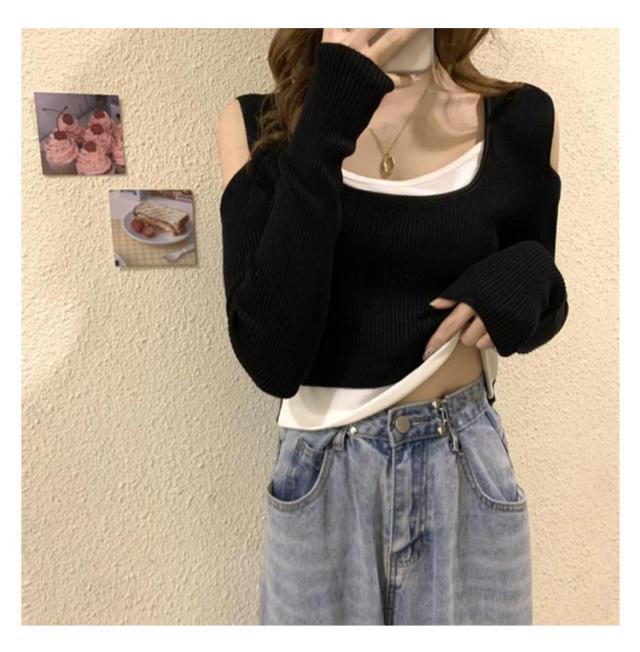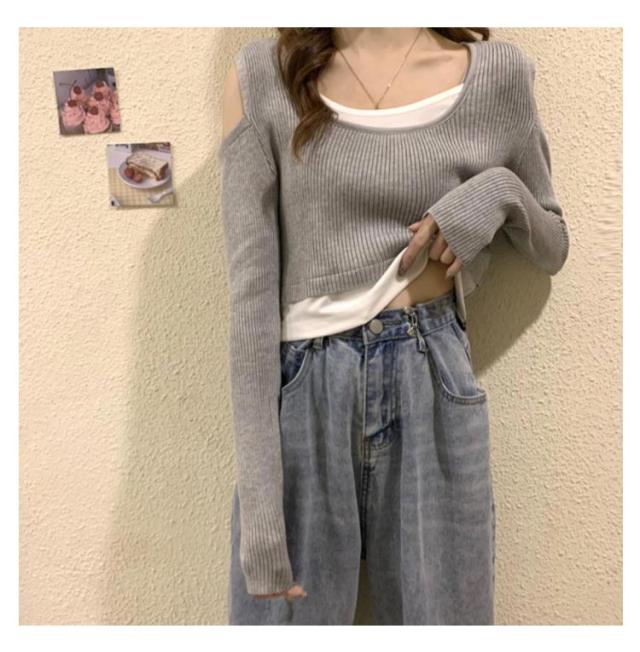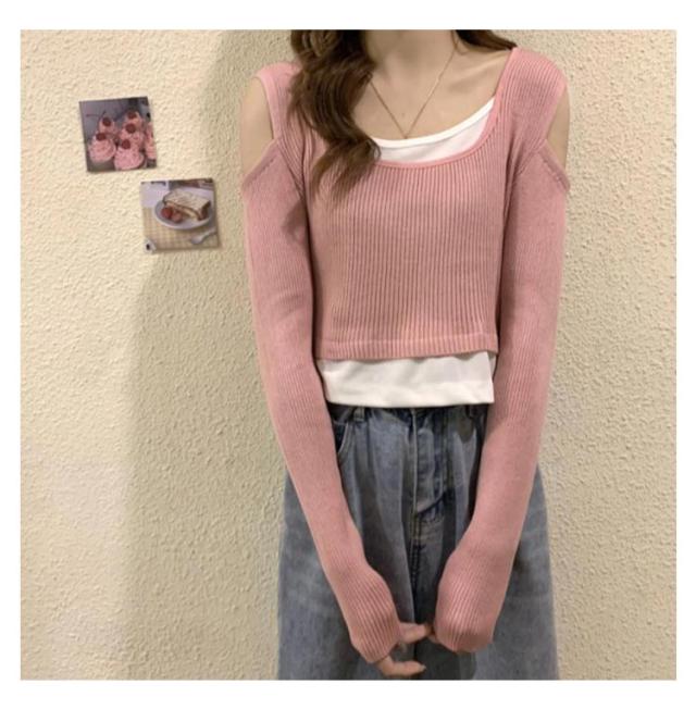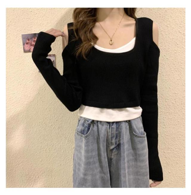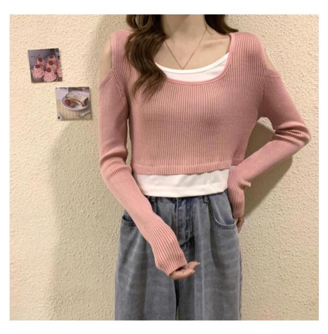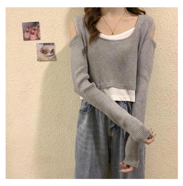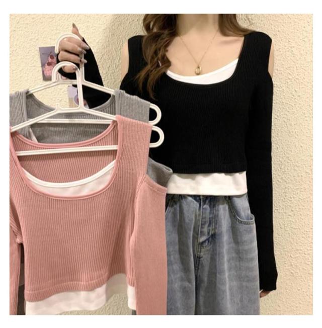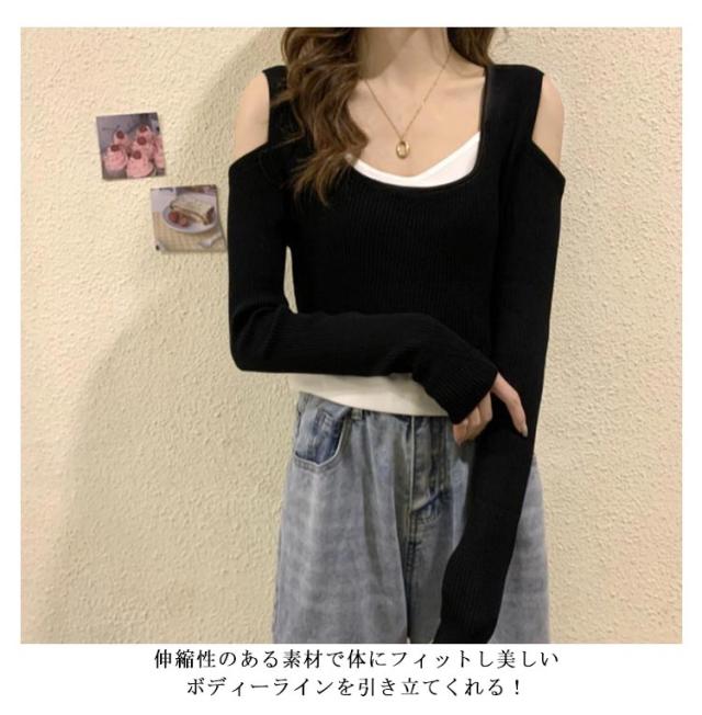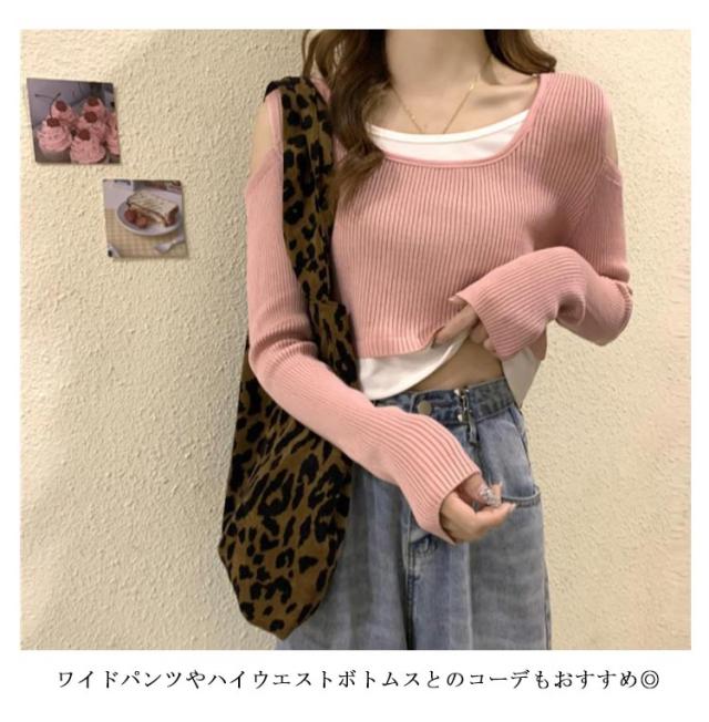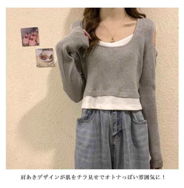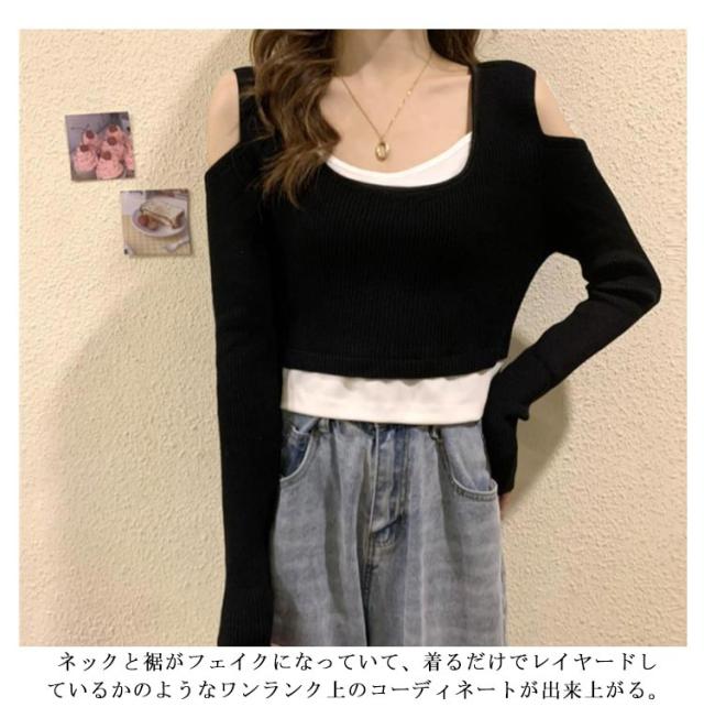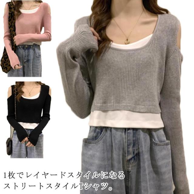 送料無料 Tシャツ 長袖 レディース 長袖Tシャツ Uネック レイヤード風 ニット 肩だし フェイクレイヤード トップス ショート丈 柔らかい 伸縮性 薄手 快適 シンプル 無地 重ね着 着回し 可愛い おしゃれ カジュアル