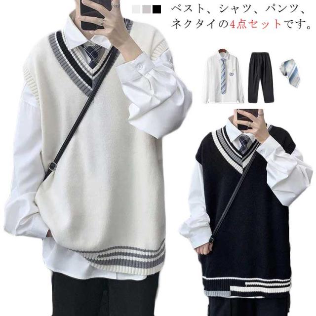 4点セット 男子制服 セーター スーツ メンズ カレッジ風 Vネック ニットベスト 白シャツ ロングパンツ ネクタイ付 学生服 制服セット jk 制服 長ズボン ジュニアスーツ 通学 入学式 お受験 発表会 ゆったり 大きいサイズ 秋冬 春 送料無料