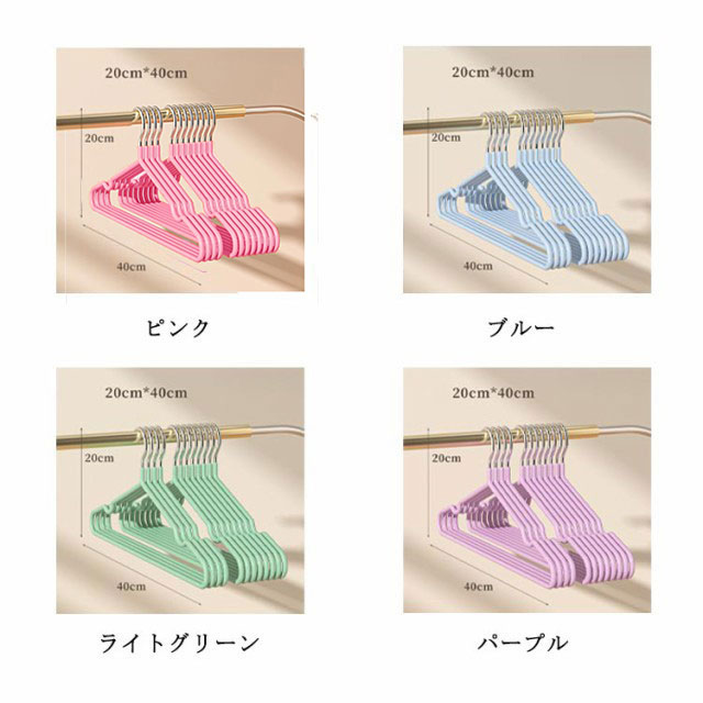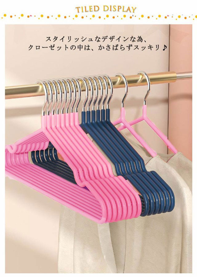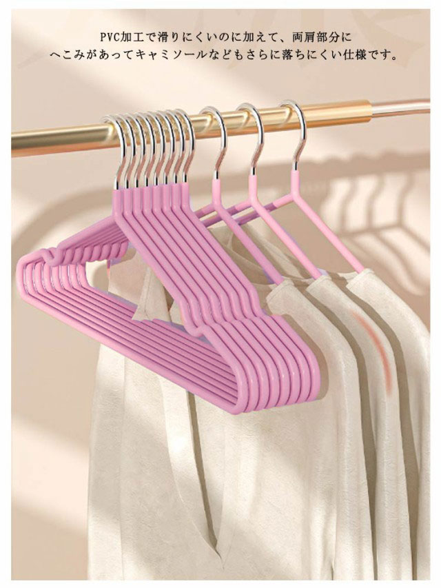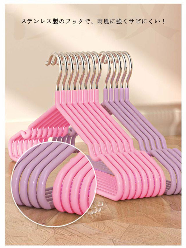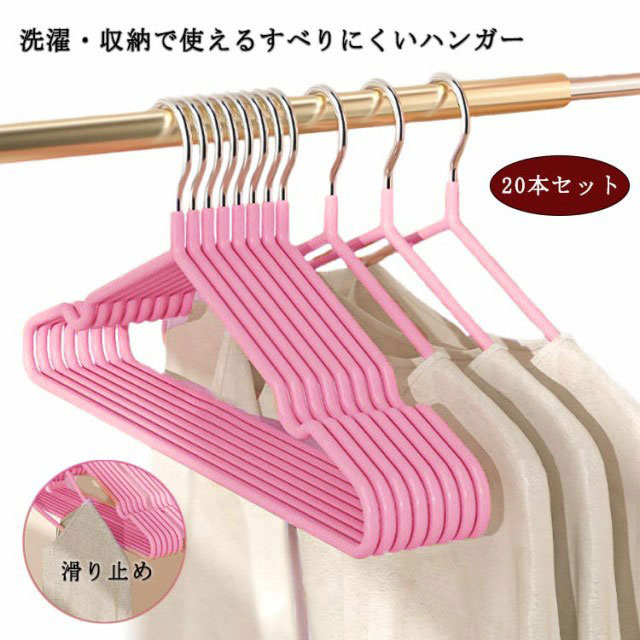 | 洗濯・収納で使えるすべりにくいハンガー20本セット。 スタイリッシュなデザインな為、クローゼットの中は、かさばらずスッキリ♪ PVC加工で滑りにくいのに加えて、両肩部分にへこみがあってキャミソールなどもさらに落ちにくい仕様です。 ステンレス製のフックで、雨風に強くサビにくい! | |