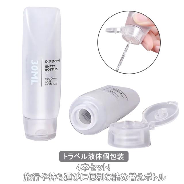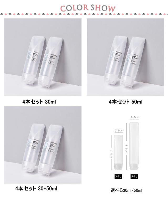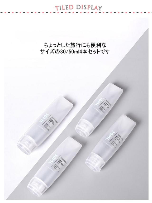| 4本セット! 旅行や持ち運びに便利な詰め替えボトル 旅行や持ち運びに便利な詰め替えボトル 大きな注ぎ口でこぼさず詰め替えができ、使用後は丸洗いでき清潔を保ちます ちょっとした旅行にも便利なサイズの30/50ml4本セットです | |