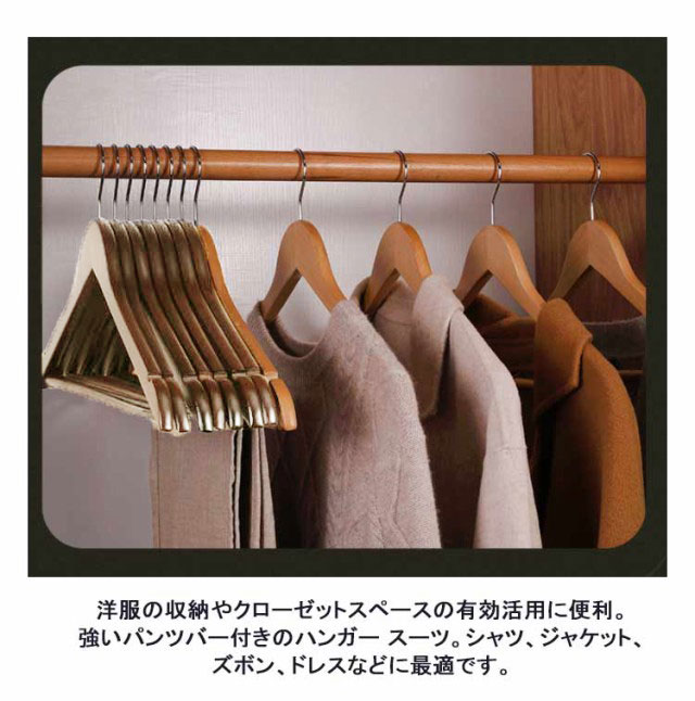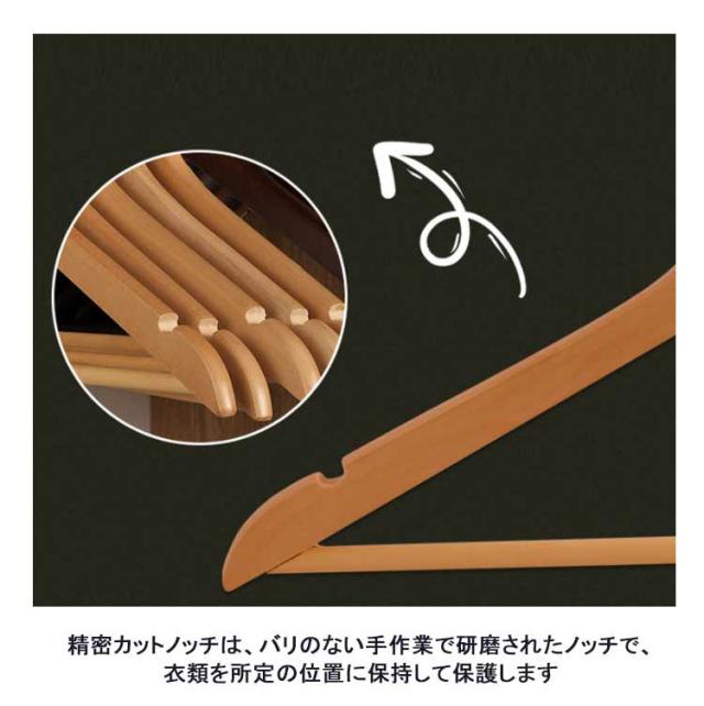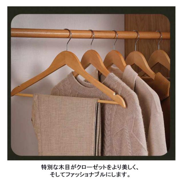 | 【100%天然木製ハンガー】高品質無垢材製で、耐久性があり丈夫な構造で、長時間使用できます。保護をさらに高めるために、環境に優しいクリアラッカーでコーティングされています。特別な木目がクローゼットをより美しく、そしてファッショナブルにします。 【滑らかな表面】表面が滑らかな研磨の行き届いた高級ハンガ木製、繊細な服を保護します。ハンガーの表面には衣服の破損を防ぐバリがありません。 【省スペース、多機能性】洋服の収納やクローゼットスペースの有効活用に便利。強いパンツバー付きのハンガー スーツ。シャツ、ジャケット、ズボン、ドレスなどに最適です。 【人間工学の設計、ハンド研磨ノッチ】人体の形に合わせてデザインされており、衣服を元の形に保つことができます。精密カットノッチは、バリのない手作業で研磨されたノッチで、衣類を所定の位置に保持して保護します。 | |
