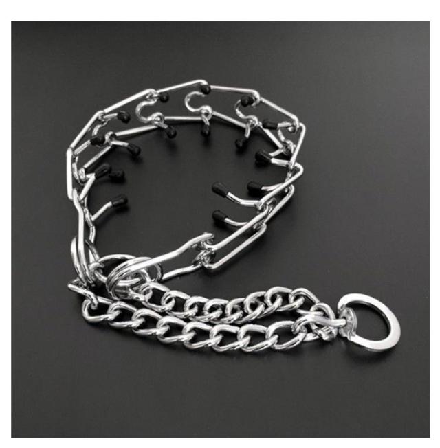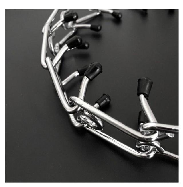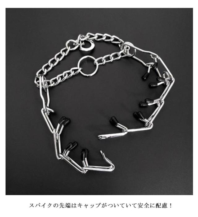 | 引っ張るとワンちゃんが首を掴まれたような状態になるトレーニング用首輪。 お散歩時のひっぱり癖を治すのに最適です。 スパイクの先端はキャップがついていて安全に配慮! | |