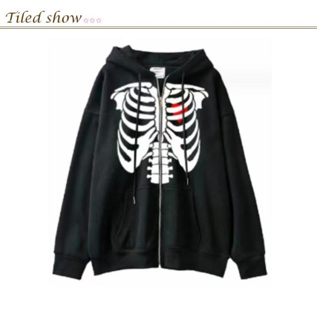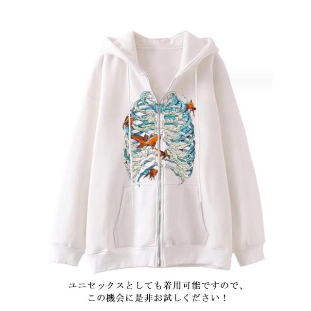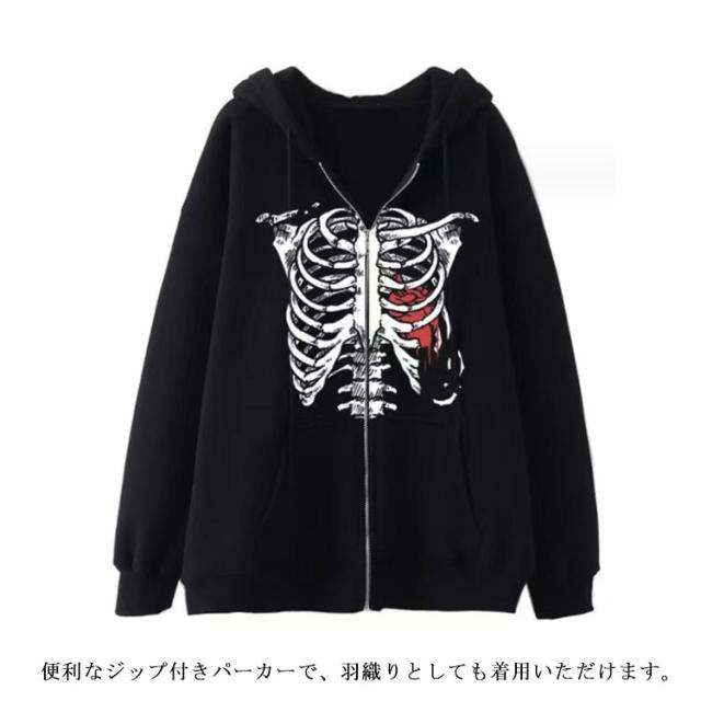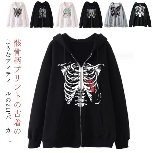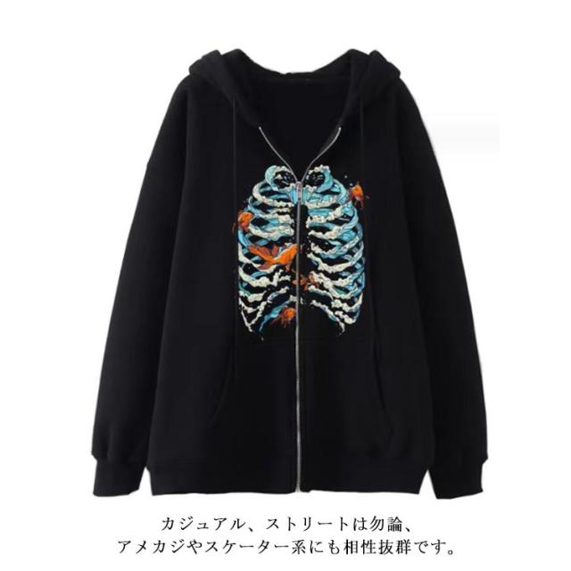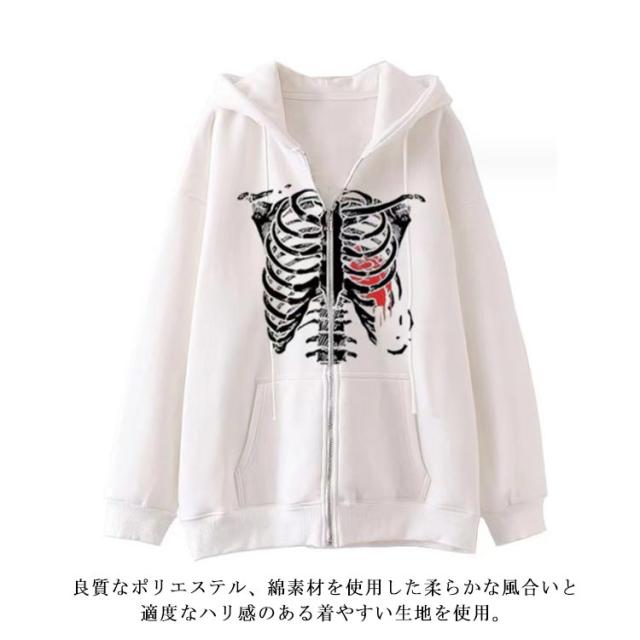パーカー 骸骨 レディース スウェットパーカー ジップアップパーカー 薄手 スウェット アウター 羽織り フード付き 春 秋 冬 ライトアウター オーバーサイズ ジップパーカー 原宿系 古着風 アメカジ カジュアル 学生 大人 おもしろ 【送無】