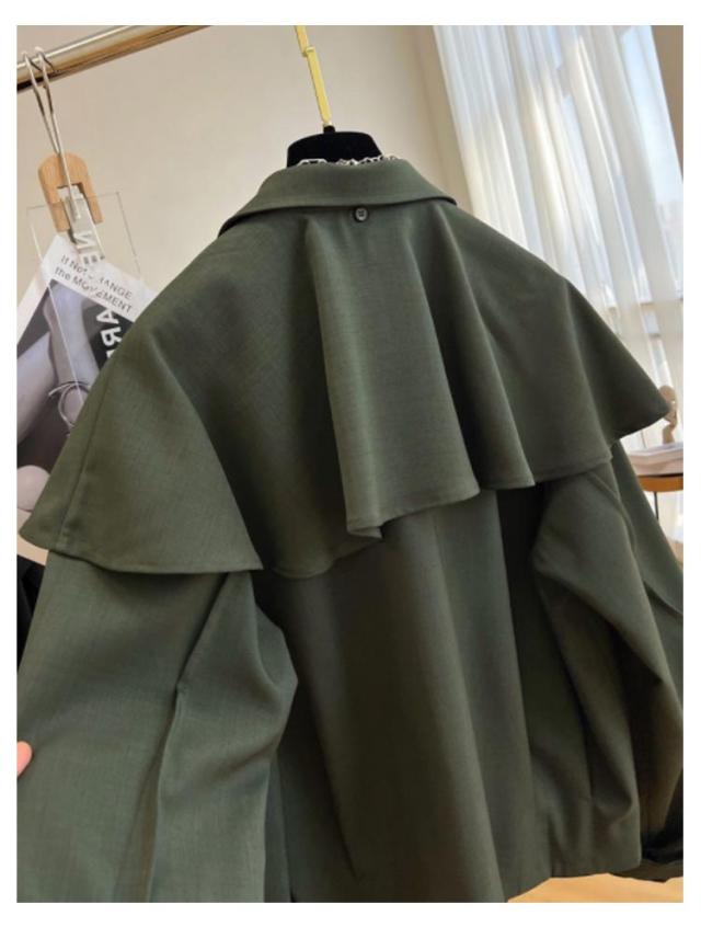 | ケープデザインが女性らしい印象のジャケット。 ボリューム感のある袖やゆったりとした身幅など、全体的に余裕のあるシルエットが特徴。 ショート丈なのでスカートやワンピとも相性抜群◎ 合わせるアイテムによって変えたりオンオフ問わず着用していただけます◎ | |