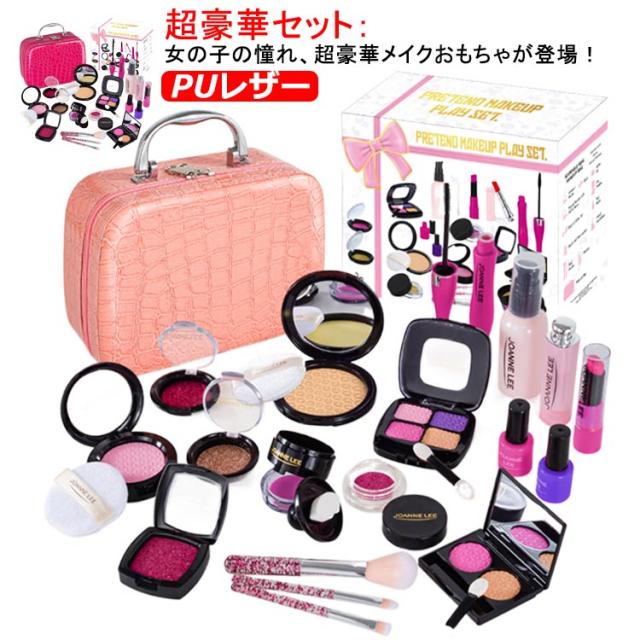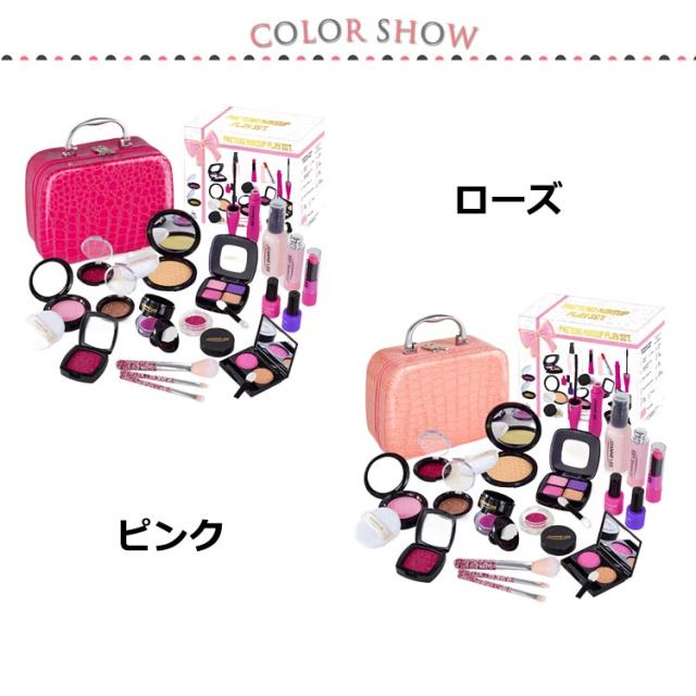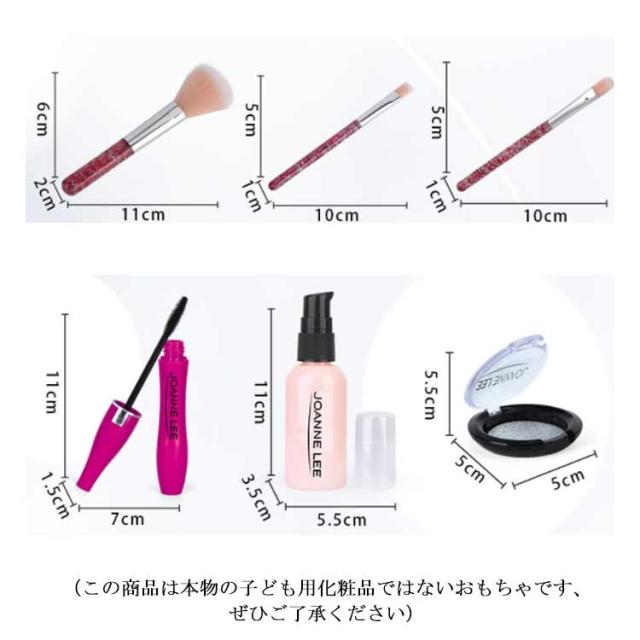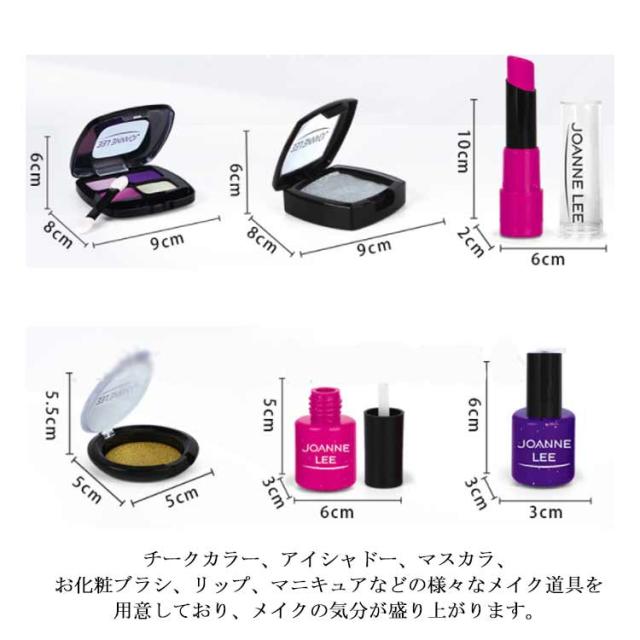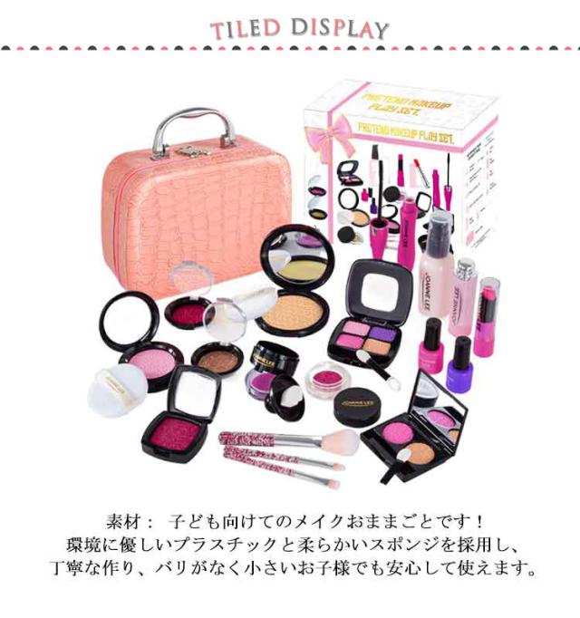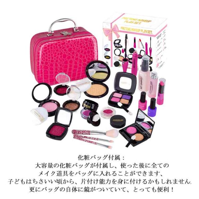 | 素材: 子ども向けてのメイクおままごとです!環境に優しいプラスチックと柔らかいスポンジを採用し、丁寧な作り、バリがなく小さいお子様でも安心して使えます。(この商品は本物の子ども用化粧品ではないおもちゃです、ぜひご了承ください) 超豪華セット: 女の子の憧れ、超豪華メイクおもちゃが登場!チークカラー、アイシャドー、マスカラ、お化粧ブラシ、リップ、マニキュアなどの様々なメイク道具を用意しており、メイクの気分が盛り上がります。 化粧バッグ付属: 大容量の化粧バッグが付属し、使った後に全てのメイク道具をバッグに入れることができます、子どもはちさいい頃から、片付け能力を身に付けるかもしれません。更にバッグの自体に鏡がついていて、とっても便利! 面白いメイクごっこ遊び: メイクに興味を持ち始めたお子さんには、まずメイクおままごとから試してみるのがおすすめです。この商品は本物の化粧品ではないので、発色ができません。ですか、見た目は本物とソックリで、ごっこ遊びを通して子どもの心を満足させます! | |