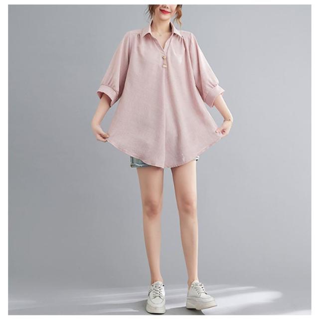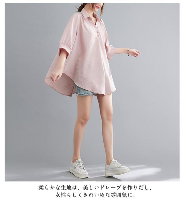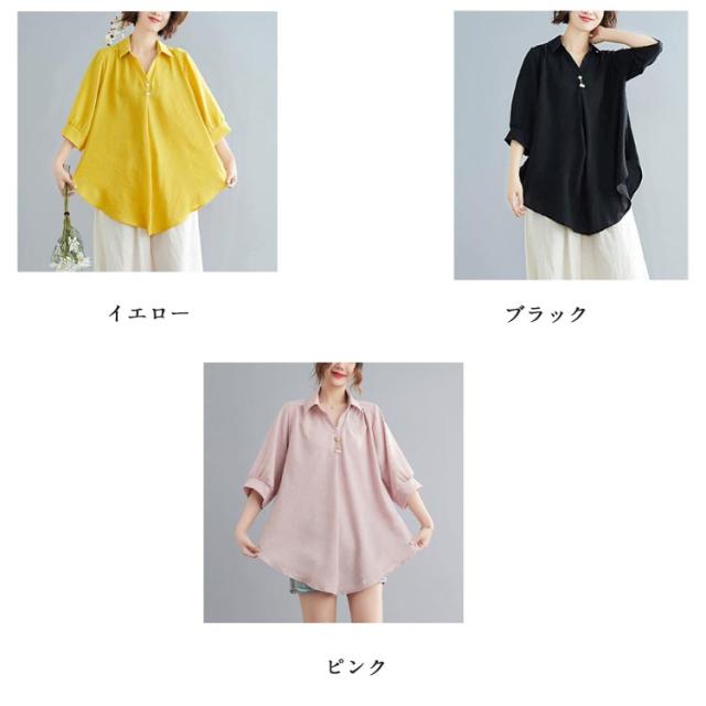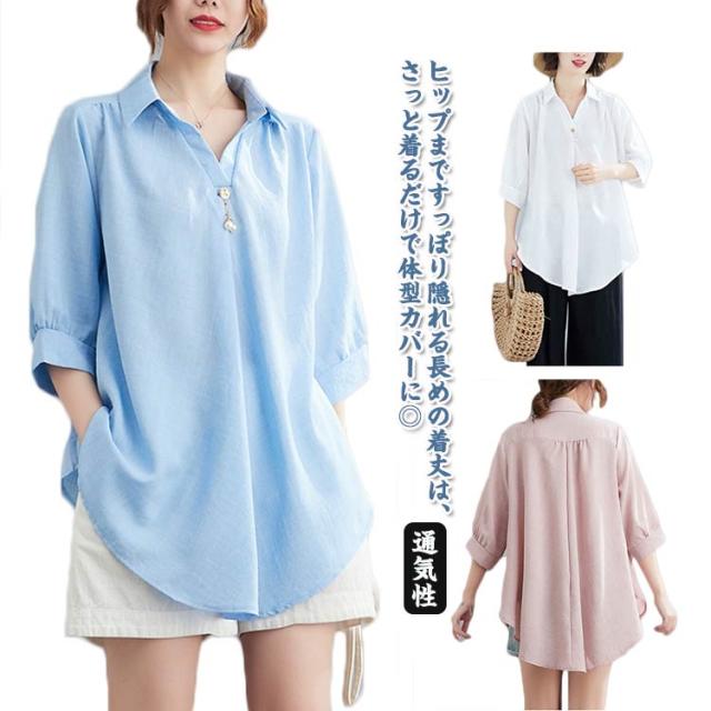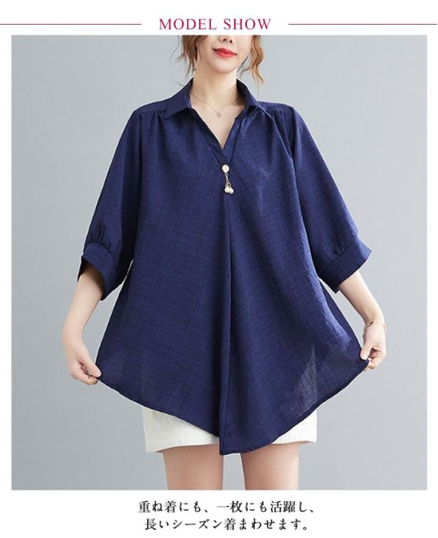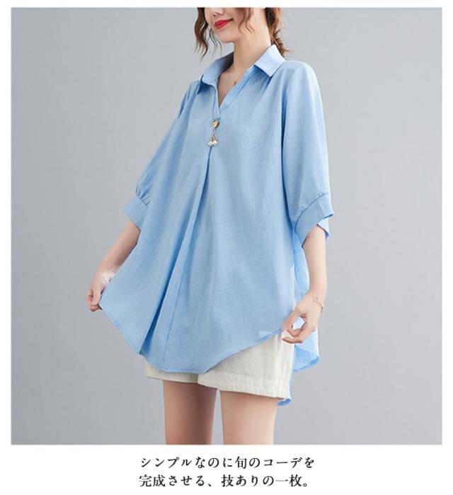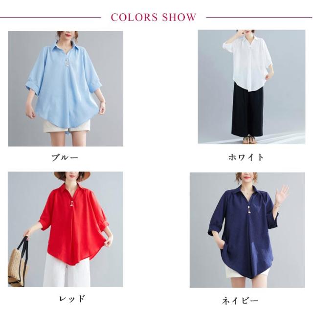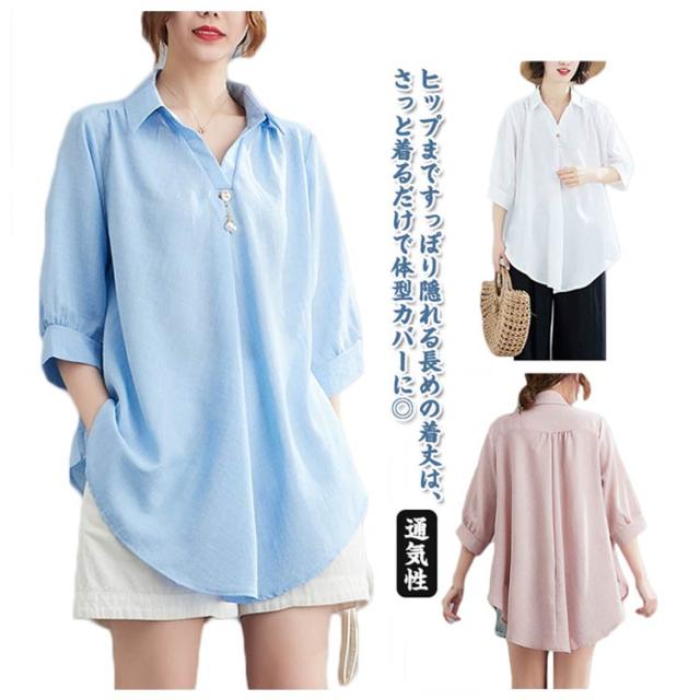 チュニック シャツ ブラウス レディース ギャザー フレアブラウス ロングシャツ 半袖シャツ ブラウス トップス 五分袖 大きいサイズ vネック ロング丈 シャツチュニック 通気性 薄手 春 秋 送料無料 ブルー ホワイト レッド ネイビー イエロー ブラック ピンク