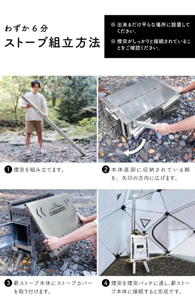 ●ストーブの周囲は安全距離を確保し、テント・椅子・薪・衣類・タオル・周囲の荷物等が接触しない距離を確保してください。