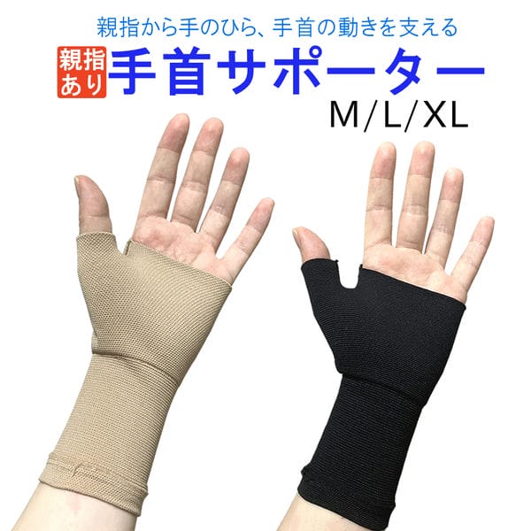 手首サポーター 親指 手のひら 手首 腱鞘 サポート 固定 伸縮性 テーピング スポーツ 家事 育児 使いすぎ 付け根 指付き 指あり 関節 保護 安静 保温 左右兼用 黒 肌色 ブラック ベージュ M/L/XL 100281
